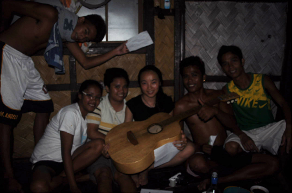 好片子没拍到,但别忘了旅行自会给你惊喜。我们刚到,就有很多男生女生一路说笑着也来了,桥头就那么点地方,大家便挤成一排席地而坐很自然的聊起天。当你面对的人热情友好爱唱爱笑,而你又不设提防敞开心扉,交朋友是那么顺理成章的事。后来又多了人加入,几只小狗也来乖乖的趴在身边,有人弹起吉他说为我们唱首好听的歌,其他人就都跟着唱起来。。。菲律宾 好听的民谣,月光,咸咸的海风,螃蟹船,水波粼粼的码头,空旷的吉他声。。。。我和XY在下一秒对视,发现对方的眼睛都有些湿。这一幕,不用喝酒也会醉人。每个人的名字我都记得,谢谢你们,这是我在菲律宾 最好的记忆之一。
