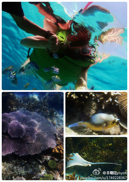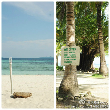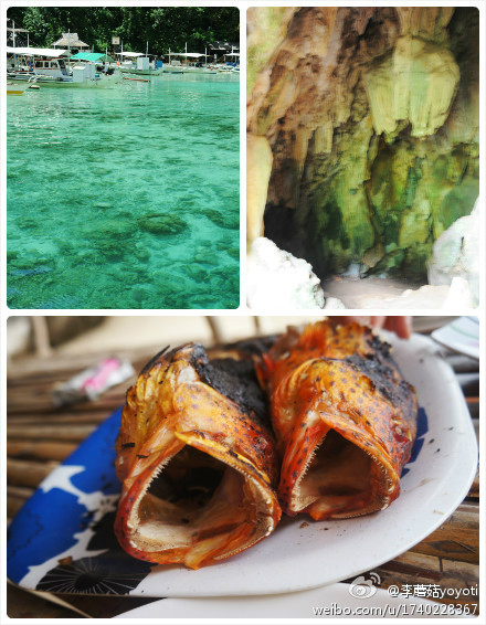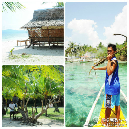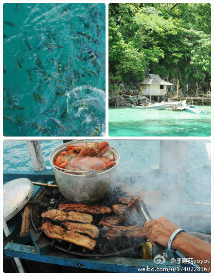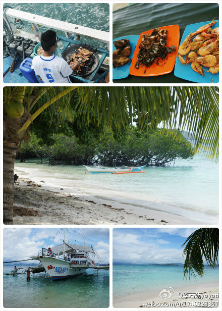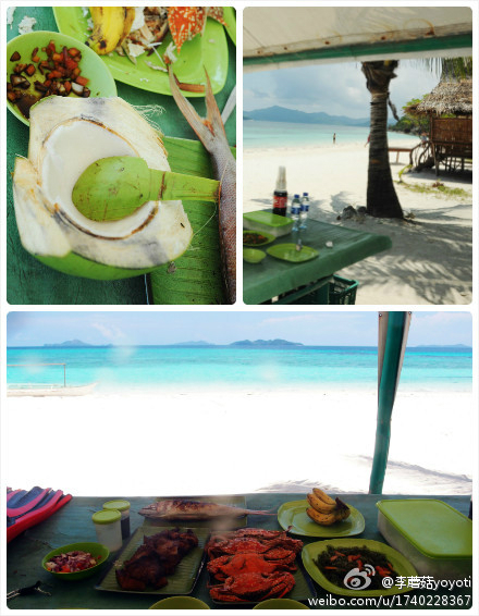 Malcapuya 岛,你们知道的那是个仙境,当天游客甚少,水清沙幼,午餐螃蟹&猪排&烤鱼&海葡萄吃到撑,不远处只有一行学生在弹吉他唱歌,伴着爽朗的笑声和听不懂的塔加洛语,25P(4元RMB)买了个大椰子面朝大海坐下,我的分身站出来说着“只管面朝大海 呲牙咧嘴 至于花 爱开不开。”oh…….就觉得人生已经不能再惬意一点了。。。喝完了果汁老板来帮我劈开椰壳,用外壳做成小勺子挖椰肉吃,再然后就把东西全丢在沙滩上,跟水手学游泳,让好心的船家拉着我浮潜。船家人真好带我游出去好远好远(一般船家只管接送和午餐),知道我对水极其恐惧很难调试,他就要我只需咬好呼吸管,看着水下的神奇景象不用抬头,游了不知多久,我一抬头四下什么也看不到了只有汪洋,这也太刺激了,我怕自己被吓晕死在海里马上做手势回去,哈哈,不过这次浮潜真心难忘---都说世界上现在只有三个地方的水下环境最好,菲律宾 科隆 是其中之一,我也算见识了,那些珊瑚和鱼好美好美好美好美。