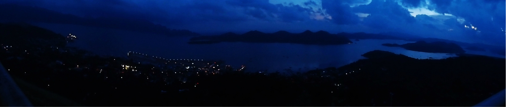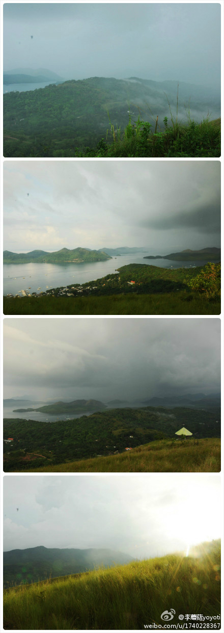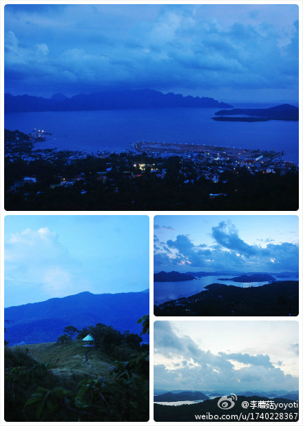 艰难到达山顶,却又是漫天的云,还是看不到太阳和山峦亲吻消失的画面。。。雨季就是这样的,我已经很幸运了,并不失望。眼前的山峦大海一副时空未辨的恒久摸样,没人能猜中她层叠的心事,我很享受这一切,看着满目的美景,听着嘈杂的声音归于平静,心情也很恬淡,不知不觉就这么发着呆,在山顶安静的坐到天都黑下来。