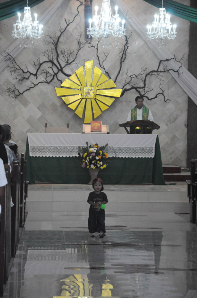 大家都在凝神唱诗,只有他新奇无比的瞪着大眼睛在过道上自己玩,画面和谐哦。