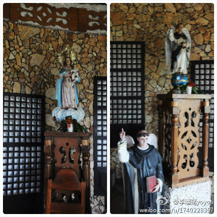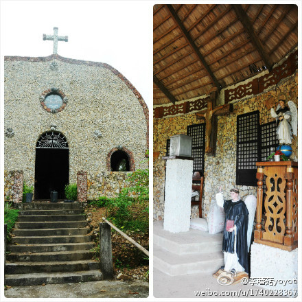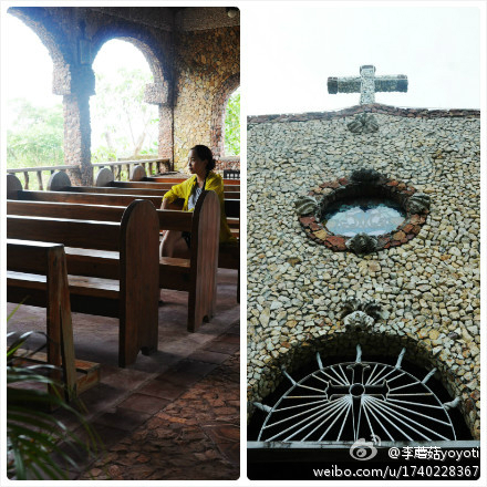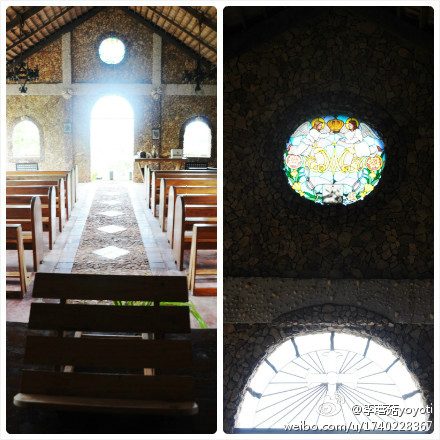 这真是一个美好的事物。说它美好,肯定是比非诚勿扰里的忏悔教堂要美好十倍不止。石子与贝壳砌就的墙壁,古老木制的桌和椅,铁铸的吊灯,彩绘的玻璃,最主要的是一切都透着一股简单恬静,仿佛积年的记忆与心事就那么静悄悄幽幽然伫立在小山上,已快被树丛埋没。