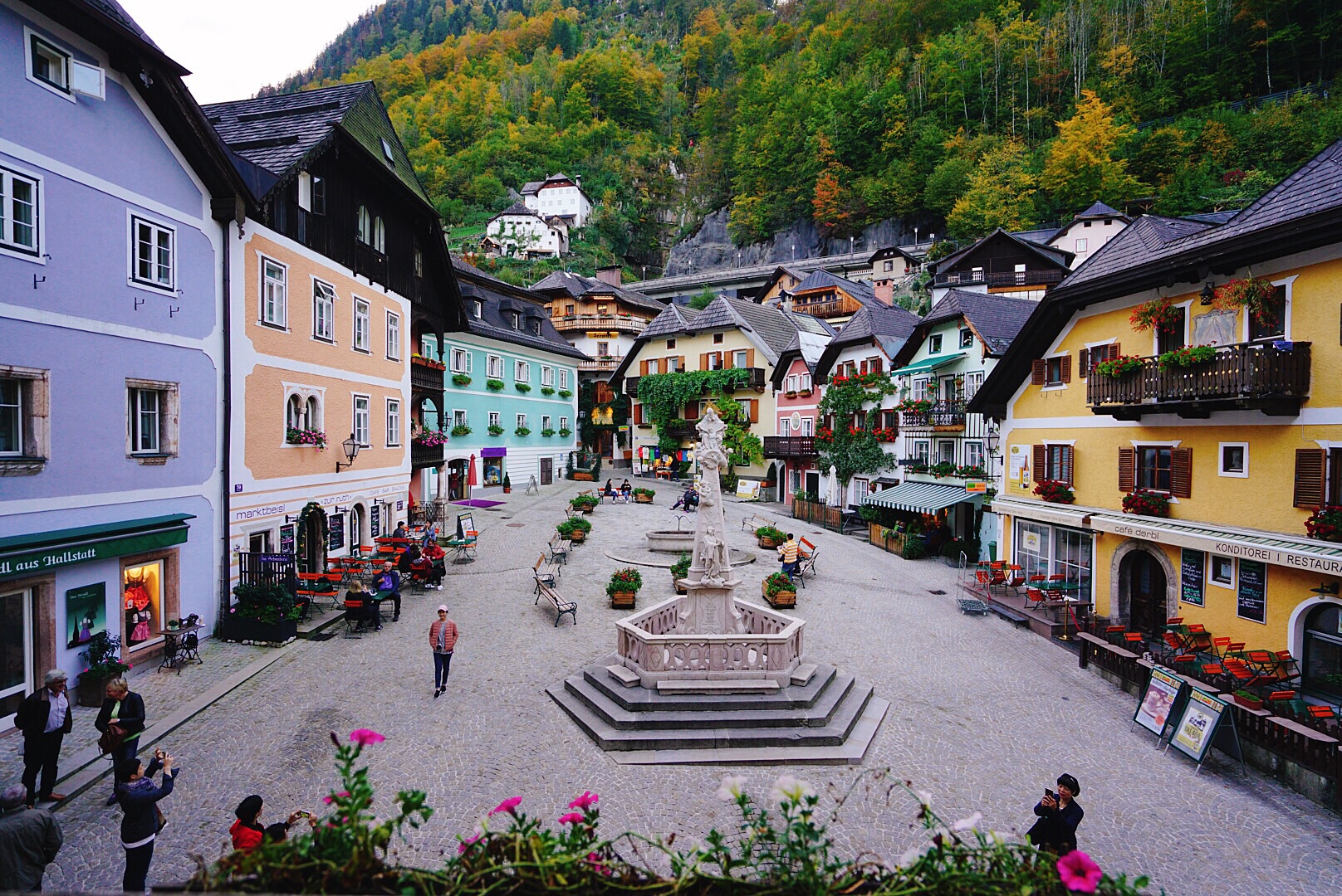 哈尔施塔特的城镇中心,周边有很多纪念品商店,广场上有时还有小型表演