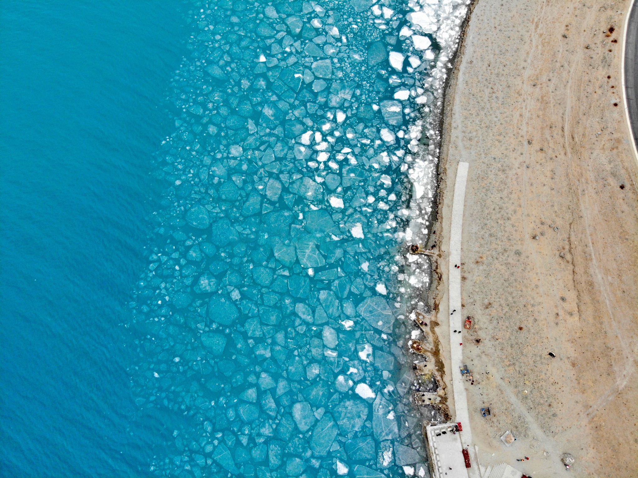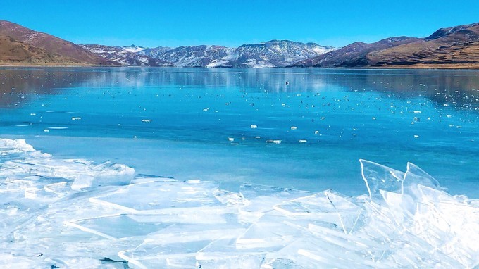羊湖,蓝冰在日光下熠熠生辉。