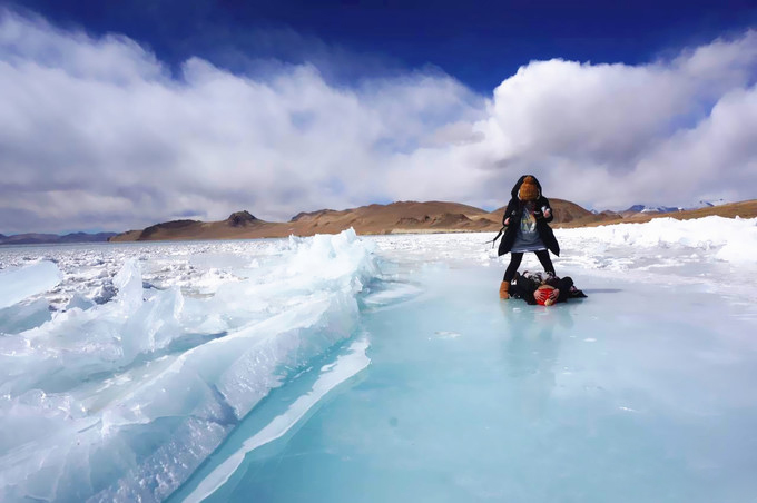 冬季的普莫雍措,也是纪录片《第三极》的取景地,一到12月下旬,湖面开始结出厚厚的蓝冰,并伴随着白色的气泡和冰裂,在四周多座超7000m海拔的包围下,目之所见相当震撼。