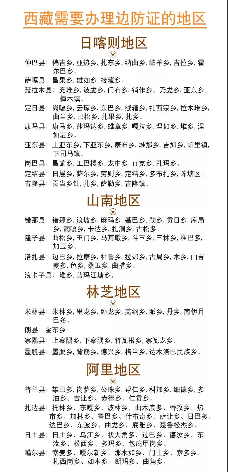 西藏边境县需办理《边境通行证》才能进入的有:林芝地区4个(察隅县、墨脱县、米林县、朗县)。山南地区4个(隆子县、错那县、浪卡子县、洛扎县)。日喀则市9个(康马县、亚东县、岗巴县、定结县、定日县、聂拉木县、吉隆县、萨嘎县、仲巴县)。阿里地区4个(普兰县、札达县、噶尔县和日土县)。