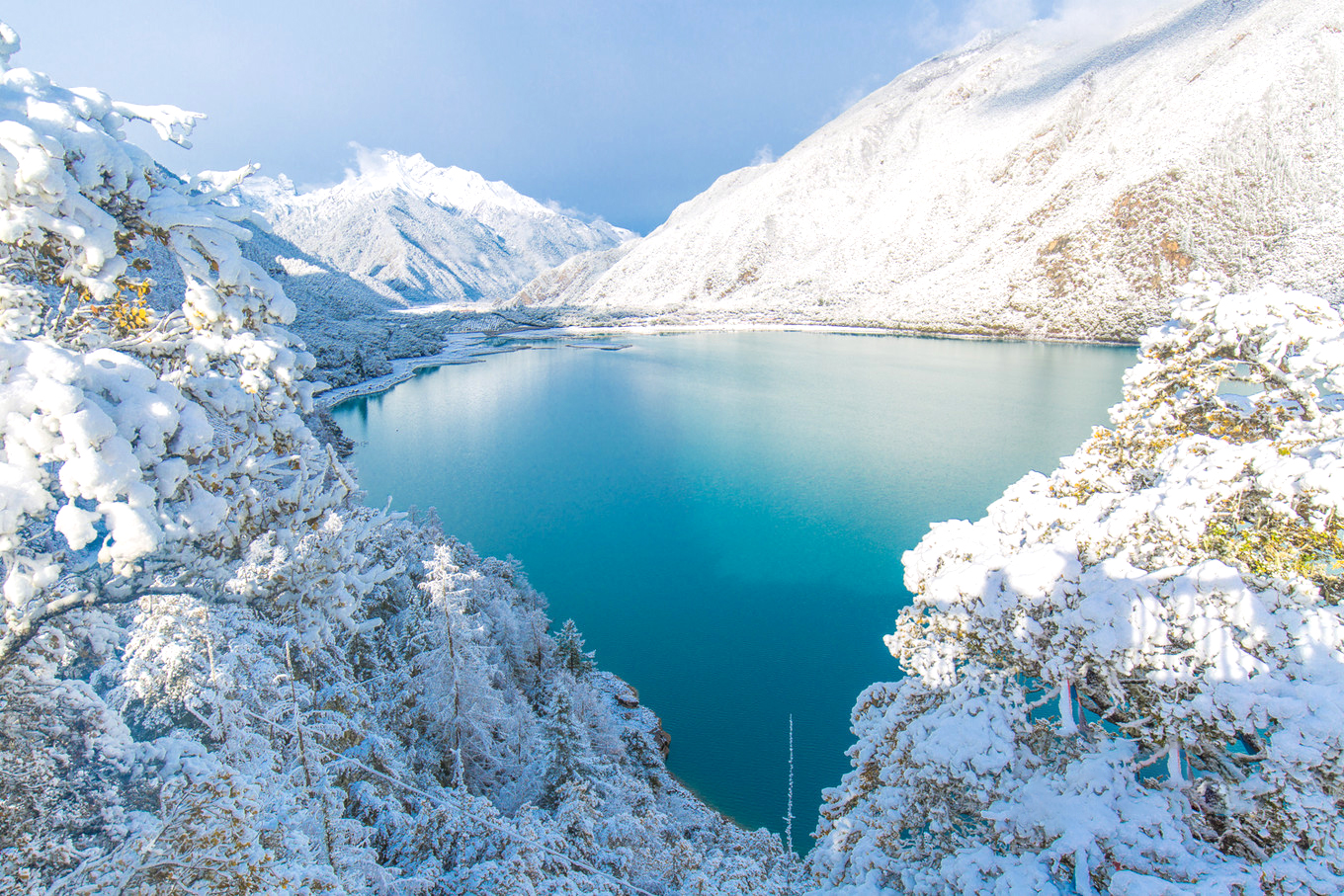 冰封的羊湖、满拉水库在白色的映衬下更加夺目,色彩的碰撞带来强烈的视觉张力