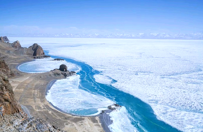 圣象天门一到冬季,湖水会从蓝色的碎冰直到冻地结结实实的,这时候可以肆意地踏上湖心漫步,解锁更多拍照姿势,并且低气温让对面的整条念情唐古拉山脉更加雄伟壮观清晰。