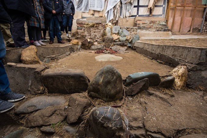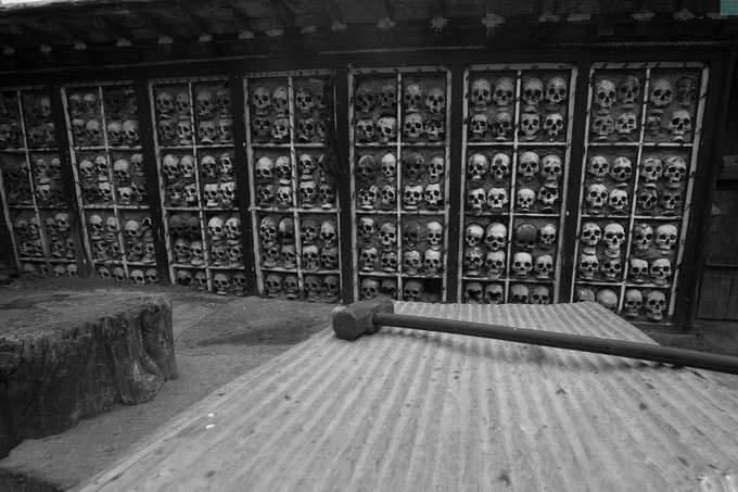 骷髅墙位于达姆寺天葬台,达姆寺和热登寺的两个天葬台都存有骷髅,由一名天葬师主理,两寺间有索桥相连,可看作为一体,达姆寺天葬台已经停止对外开放,骷髅墙位于房内,人头骨象砖块一样一层一层地垒砌起来,大概有数百个骷髅头骨,使每个活着的人一看到它们就会想起自己的归宿。