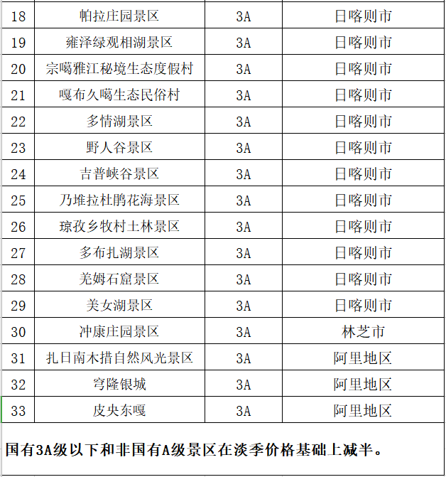 国有3A级以下和非国有A级景区:在淡季价格基础上减半。