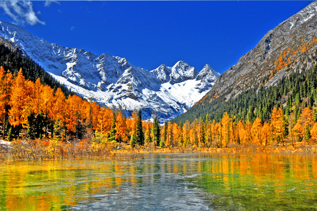 如果想要观赏彩林和拍到最美的图片,那一定要在深秋的时候前往达古冰川。每到秋天,达古冰川便开始奏响了雪山与彩林的冰与火之歌。秋风把猛河两岸的林涛树海轻轻渲染,从冰川到沟壑,千树万叶将跃动的生命燃烧,冰川彩林交相辉映。在达古冰川,山下是姹紫嫣红,山顶是白雪皑皑。冰川与彩林,在这碰撞出了极具冲击性的美。