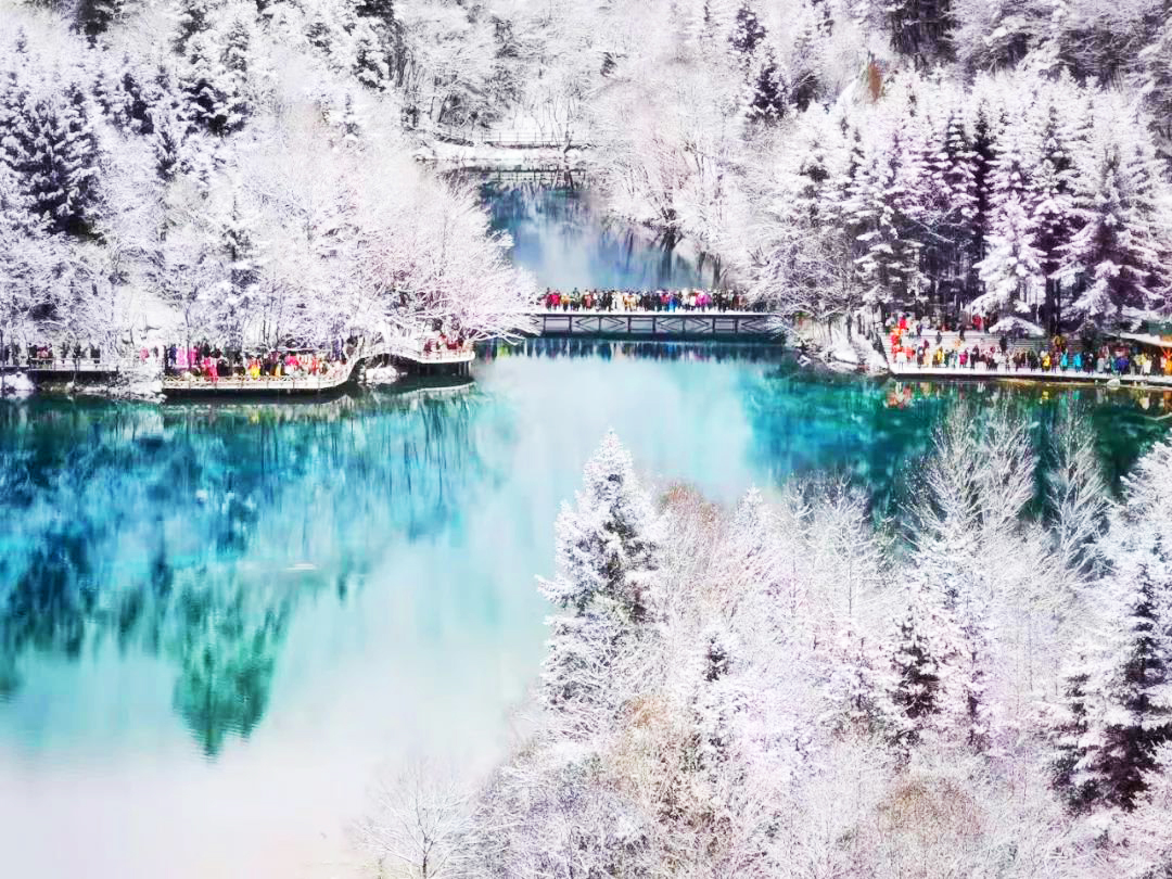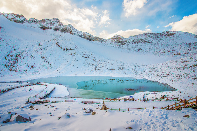 远处一片碧绿的冰渍湖—山盟海誓泪湖在一片银白色中脱颖而出,格外地吸引目光,由于温度下降,一层冰面让泪湖更添一份静态美。带着爱人到这里许愿打卡,对ta许下那份誓言。