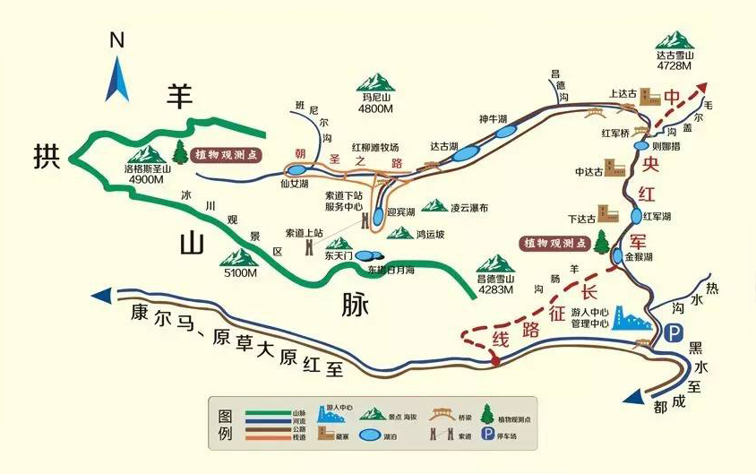 游客服务中心—金猴海—红军湖—泽娜措—红军桥—达古湖—白塔—飞龙崖—嘛呢山—娜姆湖—索道下站游客中心—泪湖