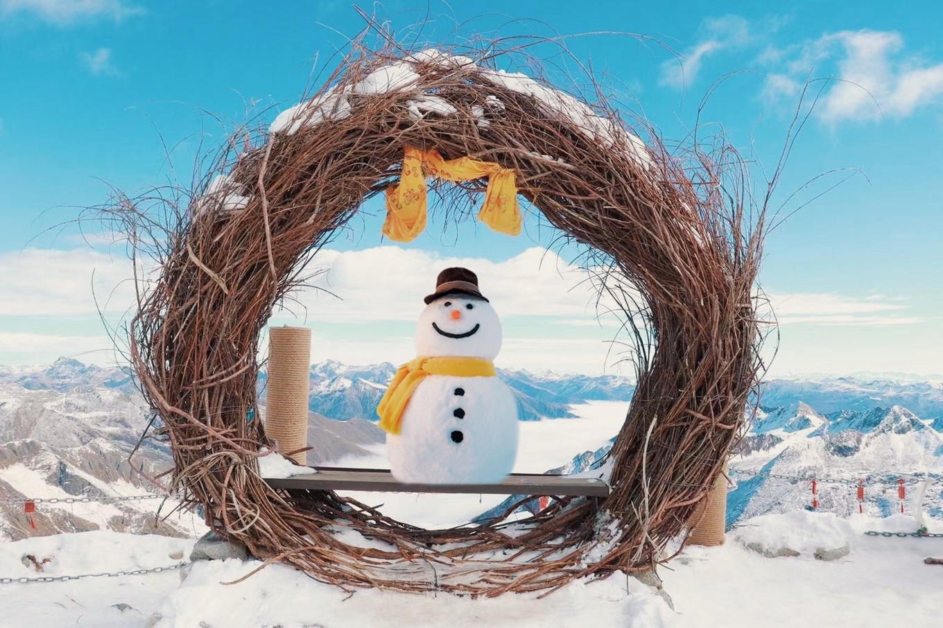 白雪间蜿蜒着一条条栈道小路,顺着观景平台朝下走就能到达咱们的冰川之眼,两个鸟巢形状显得尤为特别,雪山、鸟巢、云海、天空,浑然一体,拍照也是体验感十足,分分钟就能拍出大片即时感。