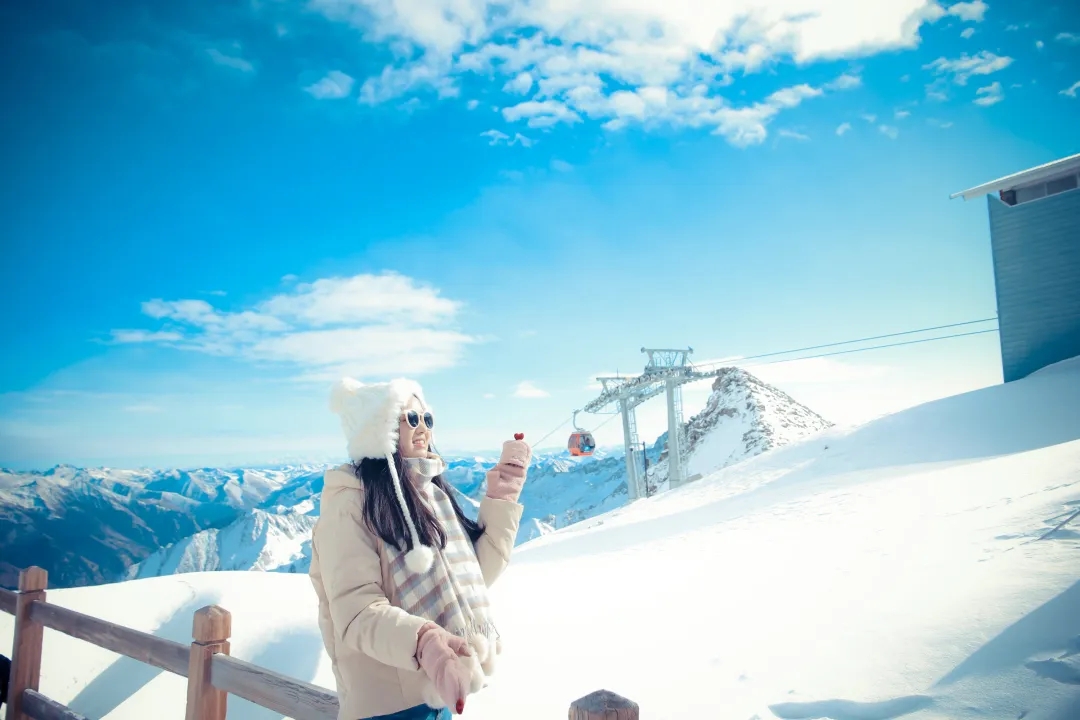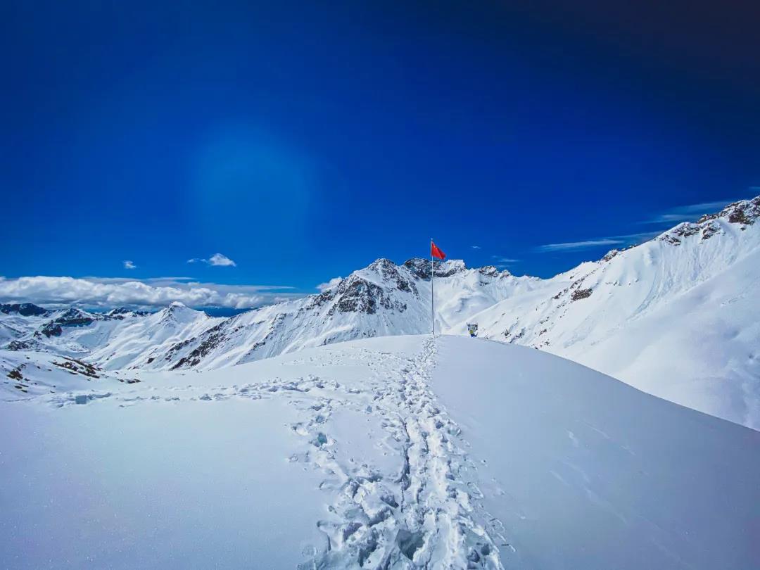 在另一边的五星红旗打卡点也是必打卡选项之一,从咖啡厅排队进下山索道时就能看见鲜艳耀眼的五星红旗在迎风飘扬着,一抹鲜艳的红在高山之间显得甚是好看夺目,壮阔雪山为背景,跟五星红旗合个影,吸收满满的正能量,也非常有纪念意义。