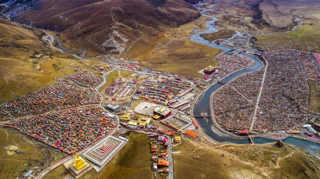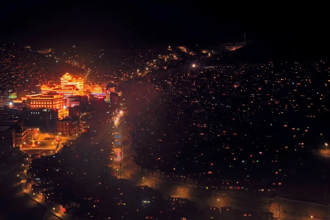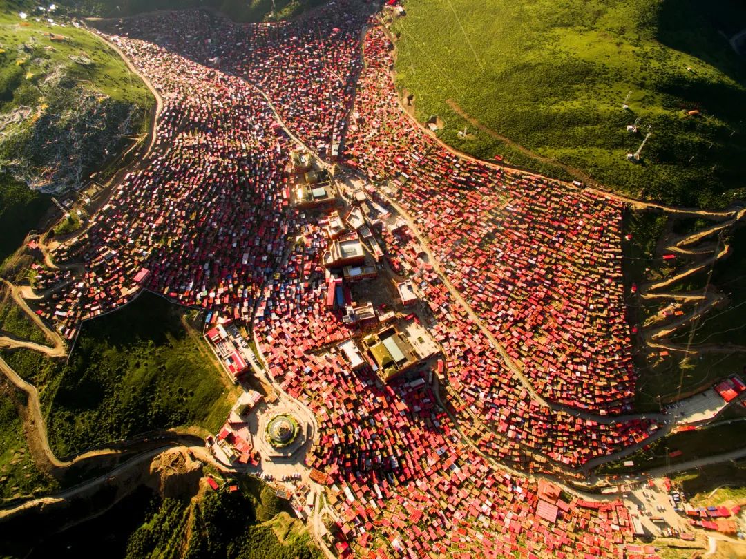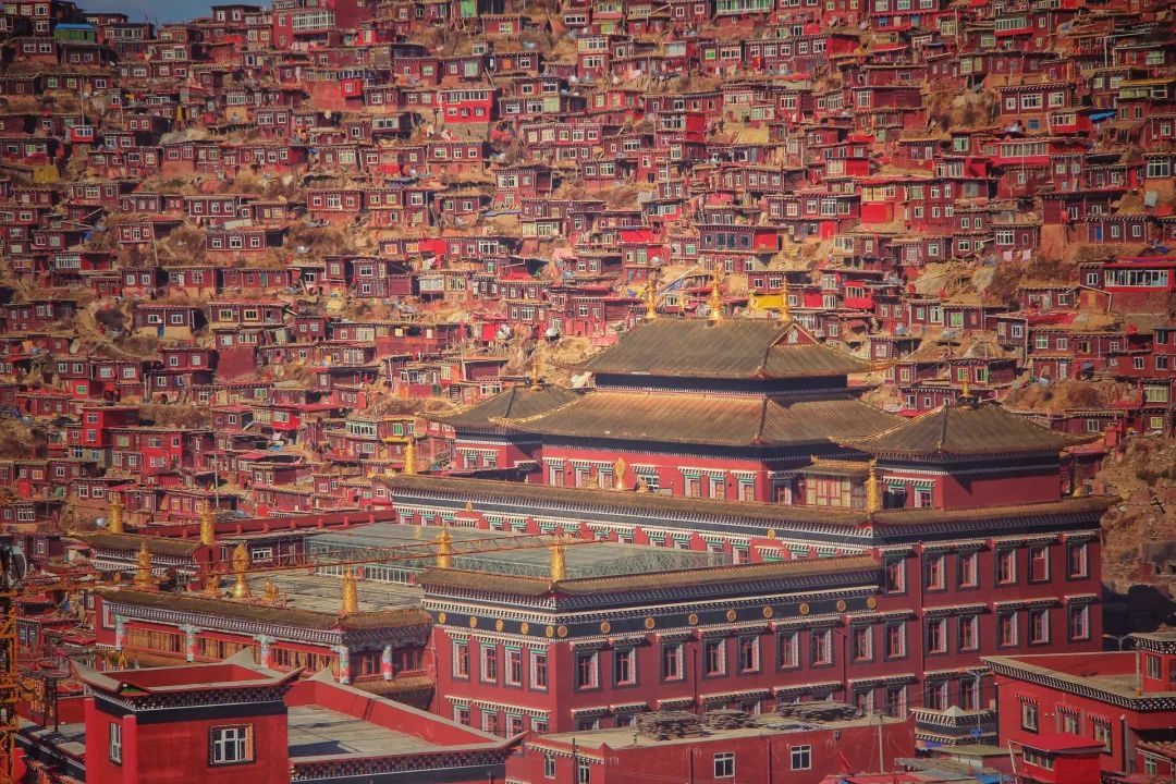 这以五明佛学院为中心,四周搭建了成千上万的红屋,接壤着连绵的青山,与远处的雪山遥遥相望,这儿的每一间房屋都是由僧人亲手搭建,身处其间,目之所及都是虔诚与信仰,流动在这片土地的灵魂圣洁得独一无二。