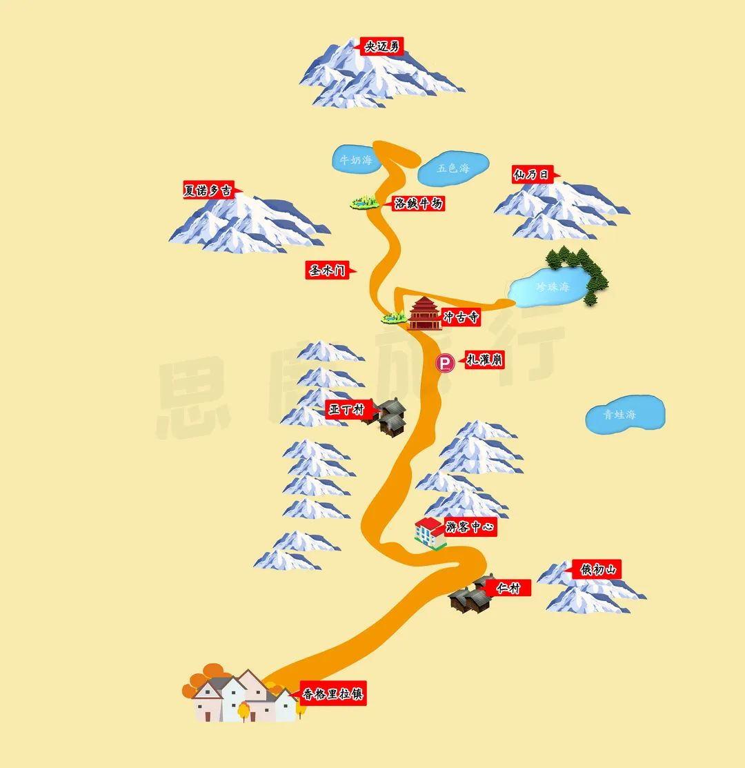 玩法攻略:从游客中心坐观光车到扎灌崩,步行20分钟到冲古寺,长线是坐电瓶车1h到洛绒牛场,往返徒步5~6小时到牛奶海和五色海。短线是往返步行2h左右到珍珠海。