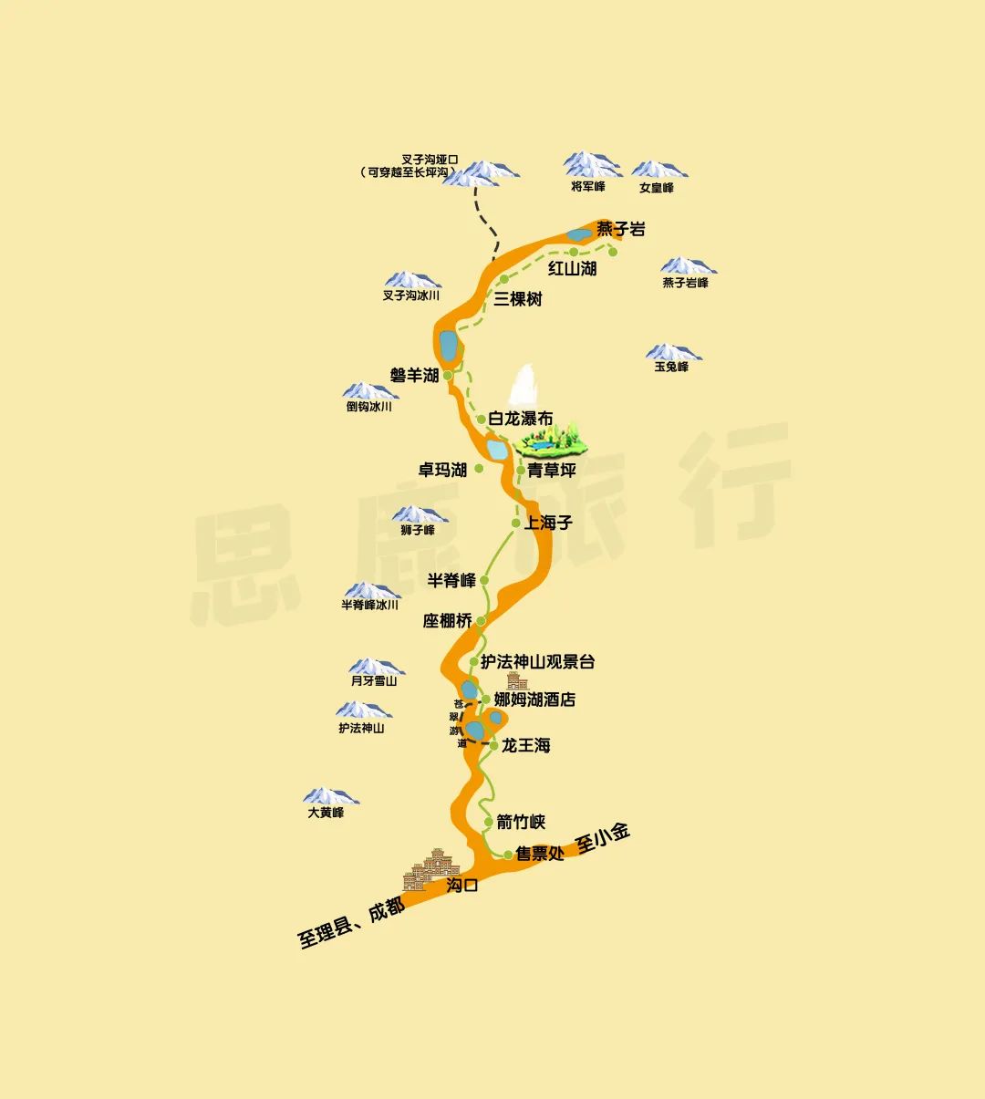 玩法攻略:三条沟的入口都不同,其中双桥沟开发最早也最完善,可徒步也可乘坐观光车,以山景为主;长坪沟可以骑马或者徒步,以原始风光为主;海子沟主要是当地人朝圣和转山的地方,游客去的较少。
