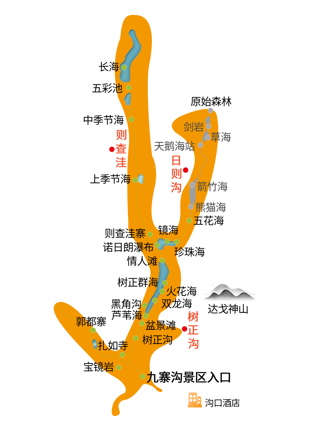 九寨沟有树正沟、日则沟和则查洼沟,景区呈现Y字形。北缘九寨沟口2000米,中部峰岭均在4000米以上,南缘达4500米以上。因沟内有树正寨、荷叶寨、则查洼寨等九个藏族寨子而得名。