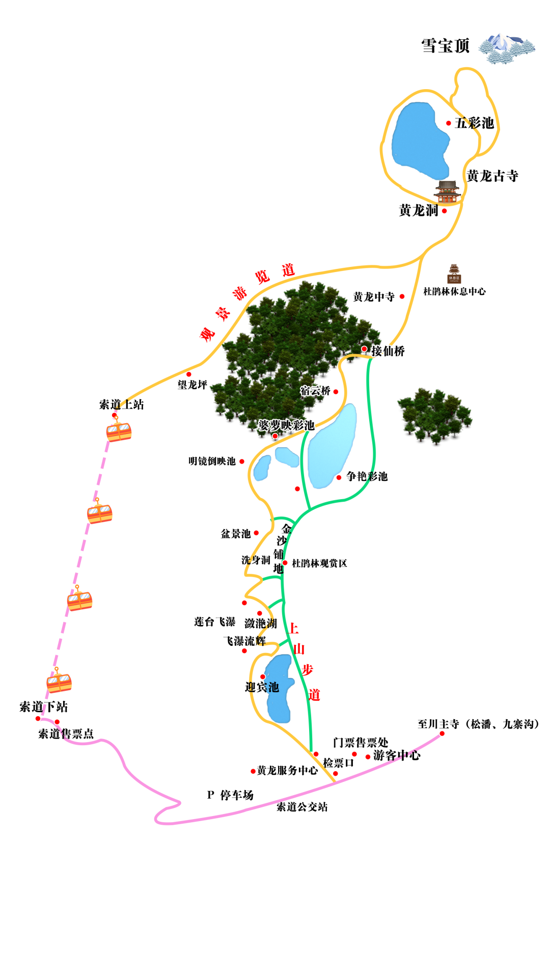 玩法攻略:坐索道上山,去到五彩池,徒步下山,沿途欣赏景点