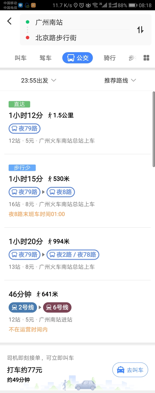 如果到了广州南站已经错过了末班的地铁,要坐什么车到北京路步行街呢?
