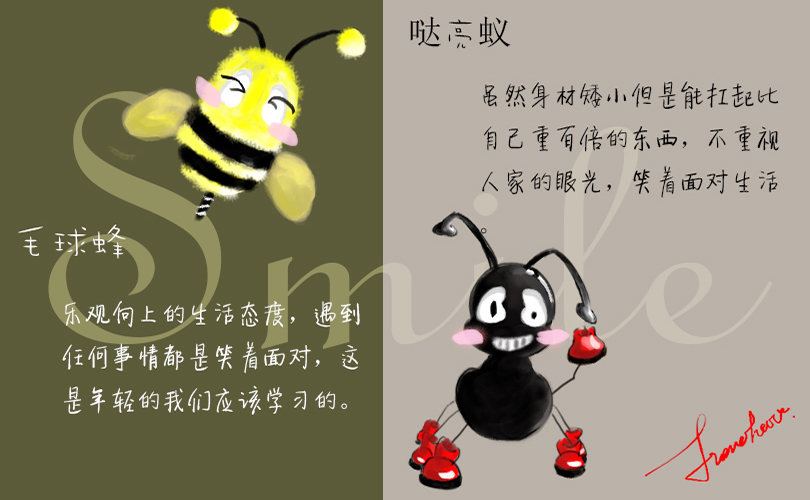 旧保留物体本身的代表性特征,蜜蜂毛绒小刺,蚂蚁黑肤以及角。