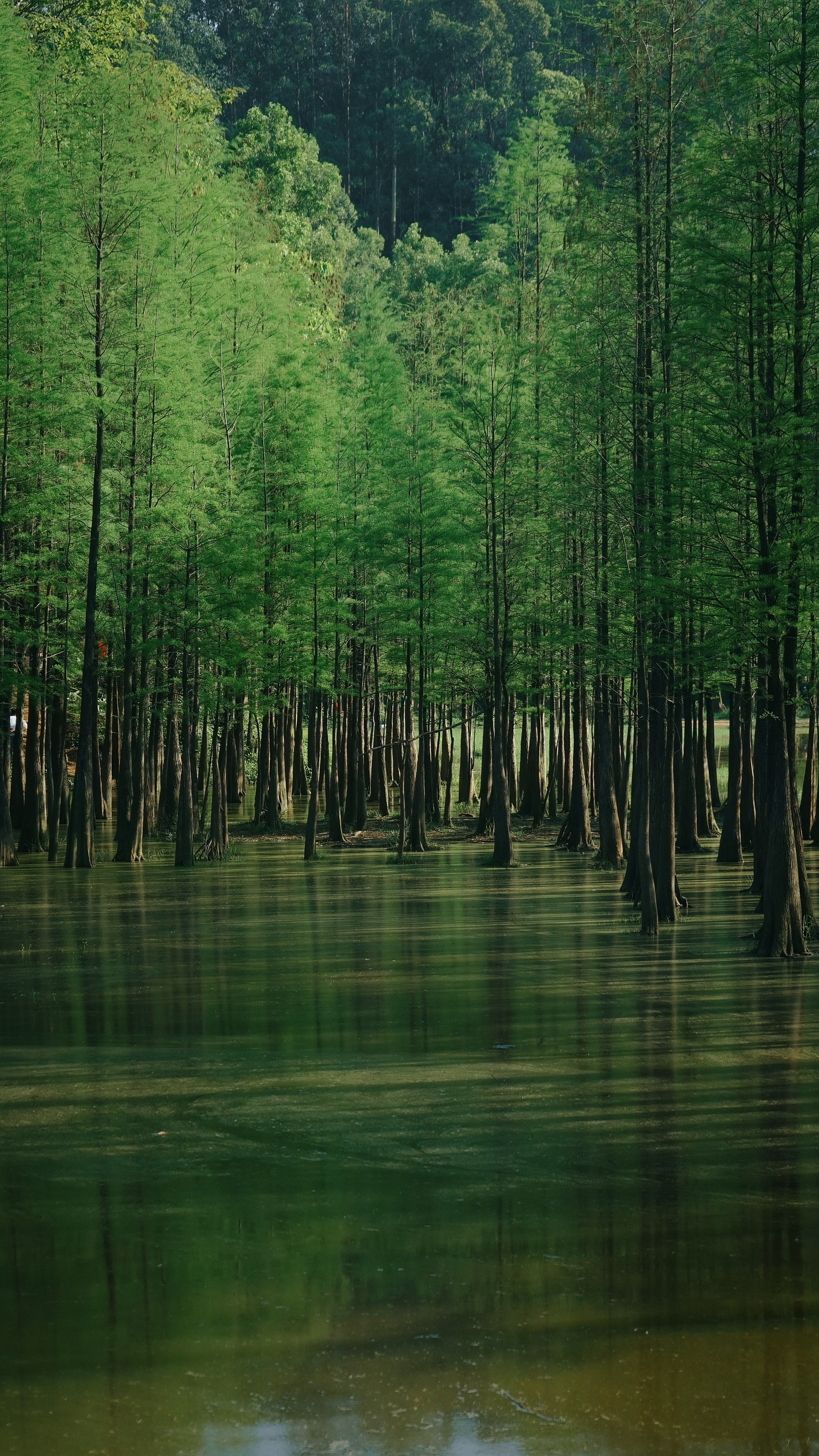 水绿绿的,和附近的山一起看显得很漂亮,当天有雾也有朦胧美的感觉