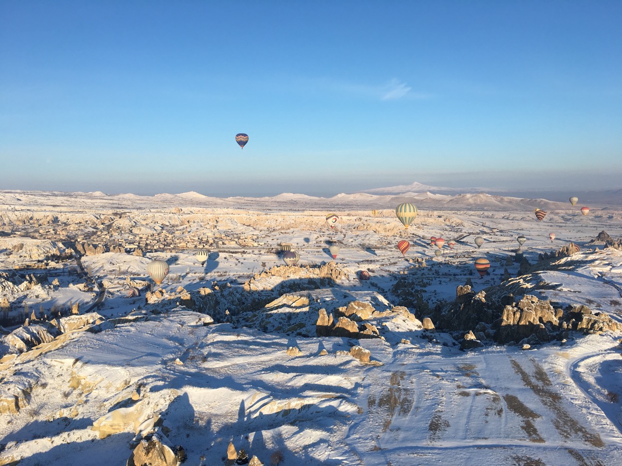 来到卡帕多奇亚绝对不会错过乘坐一次热气球,或者说来这里根本就是为了热气球的!冬天来这里能看到与攻略游记不一样的景色——雪白覆盖着的峡谷!而实际上,冬天淡季来还有不少的优惠折扣,而且游客不多不算拥挤,因此出了担心天气和风力会影响飞行之外,基本不用担心订不上任何一个热气球的位置。本人乘坐的是名气最大的Butterfly公司,飞行员气场很足,经验好,低飞时控制很精确。