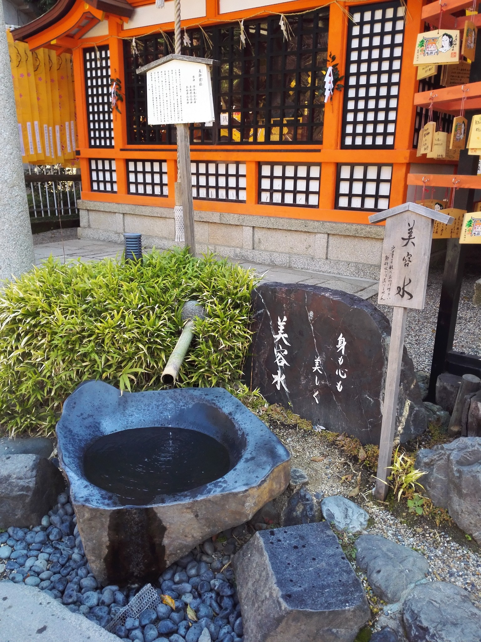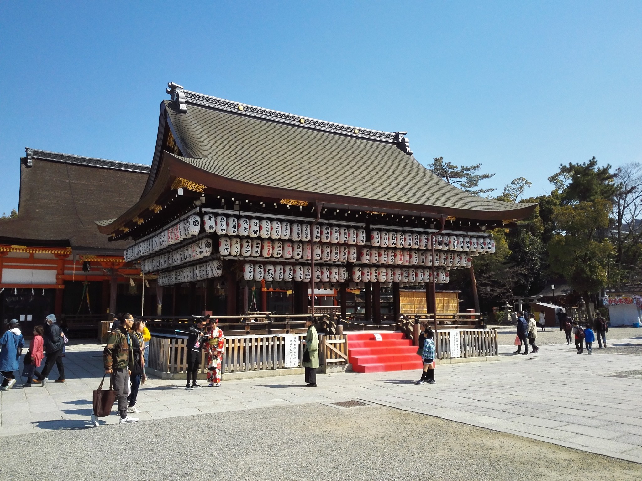 原来的祇园神社,供奉着素盏鸣尊(须佐之男),还有很多后来引入的其他神道教神仙。外围有一个由小铺组成的类似小吃一条街的街道