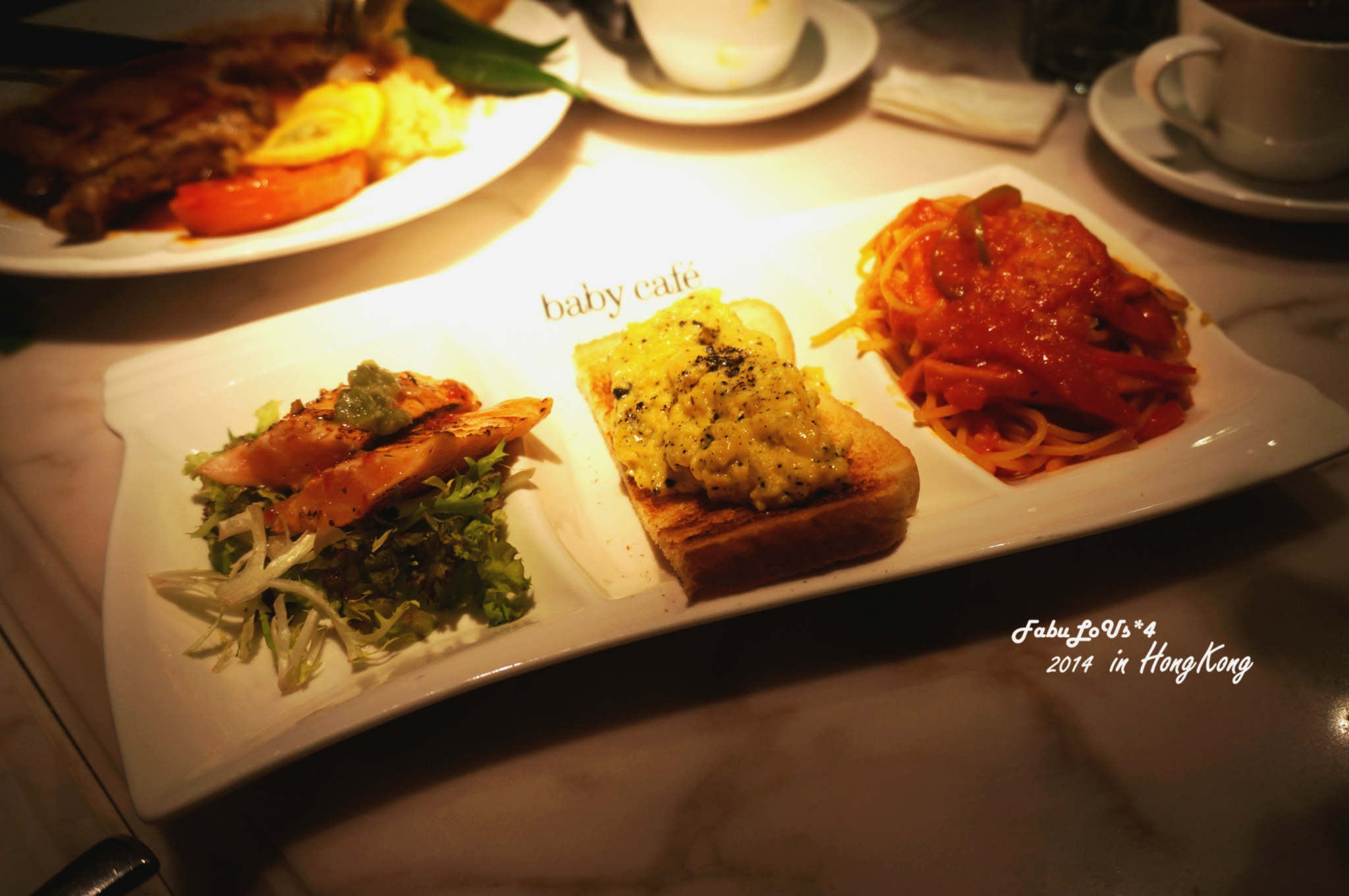 Baby cafe位于旺角地标朗豪坊商场里面,主打英式菜。Baby Cafe最大的卖点,莫过于它的老板Angelababy。餐厅装修以黑白为主,墙上挂着Angelababy的照片,是为了让客人觉得秀色可餐吧。 Baby cafe 的出品其实挺精致的,不过分量着实太小。点的那种套餐,有前菜,汤,主食,沙拉,饮品。价格大多数都是在120-220之间。另外,他们家我觉得最好吃的,是甜品绿茶心太软,流心的,甜而不腻。
