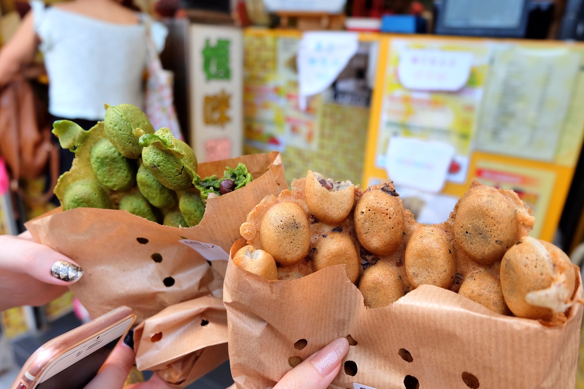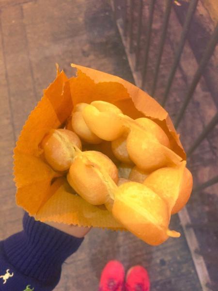 妈咪鸡蛋仔原本位于红磡天桥处,后来搬到红磡民泰街,在一品鸡煲附近,店面不大,不设座位,就只有鸡蛋仔和其他包装饮品。鸡蛋仔是香港的特色小吃,奶香酱料经过烘焙,散发出诱人的香气。每一饱满的“鸡蛋”但上去都那么可爱,外脆内软。一份原味的妈咪鸡蛋仔是15港币,另外还可以挑巧克力味或者其他。我还是最喜欢原味的。本来鸡蛋仔就很甜,如果巧克力味应该会更甜吧。
