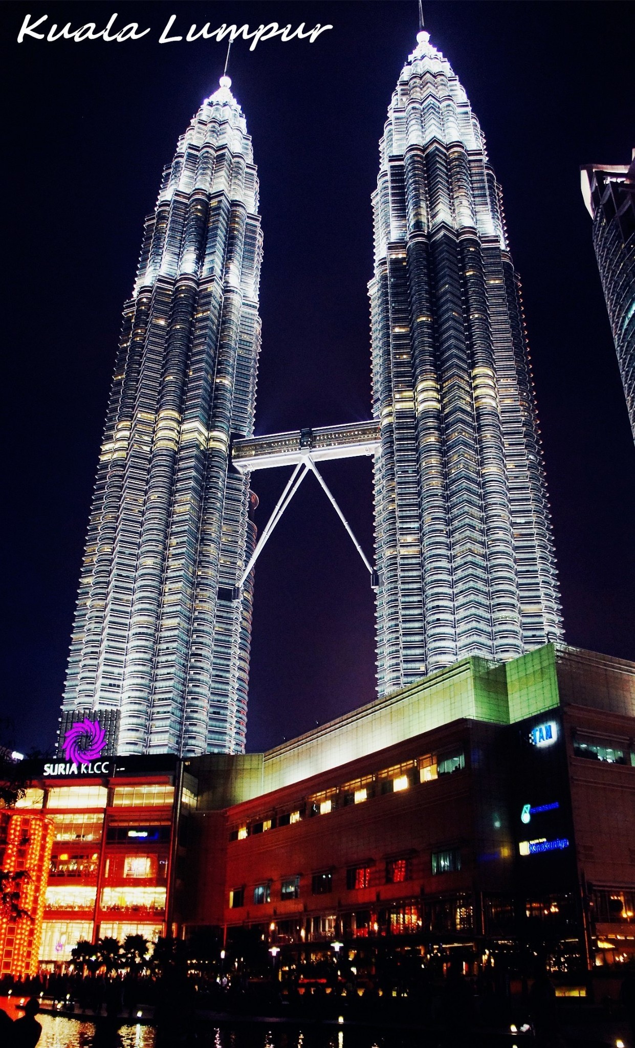 国家石油公司双子塔(Twin Petronas Towers),吉隆坡地标建筑,其实这样的大楼,这样的CBD,对于内地人来说也算屡见不鲜了,但是真正走到这里,看到它还是觉得非常壮观,特别是夜晚,灯光把它照射的如同钻石一样透明璀璨。我们并没有上塔也没去它的纪念馆。我们觉得最好的景色还是应该包含它的。旅游中心的人说附近有skybar,可以欣赏它的美景,可惜我们没有找到,有点遗憾。值得一提的是,在塔的下面有KLCC公园和水上乐园,公园人造湖的音乐喷泉每隔一段时间就会表演一次,可是免费的哦!这天晚上,我们也走累了,就像当地人一样坐在喷泉边,吃着三明治,欣赏音乐和美景,非常惬意。