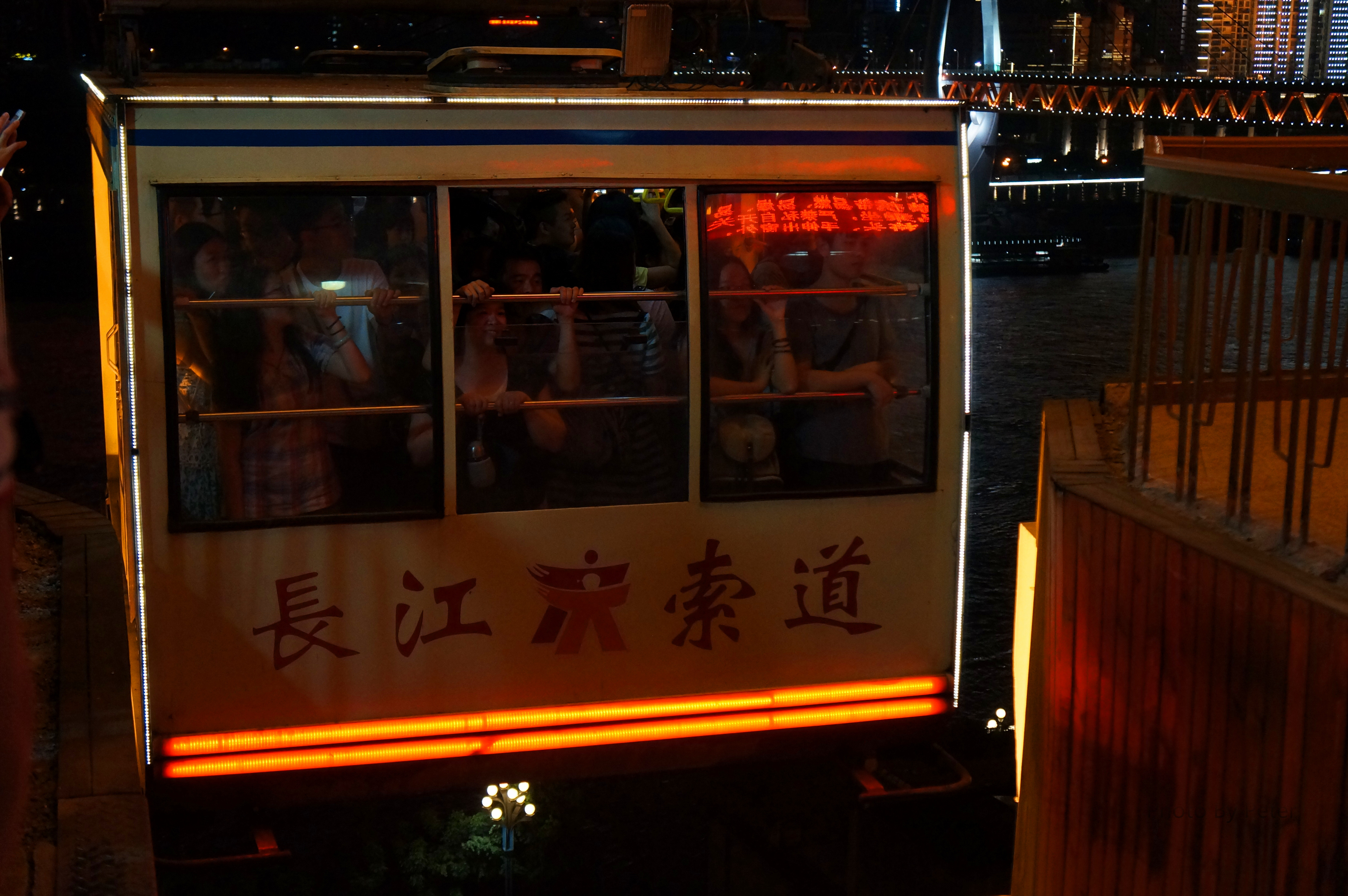 我们以为排队的队伍就眼前那么长,实际上天真的我们犯了一个很大的错误,队伍仅仅是在门口,离购票处尚且还有段距离,买好票之后还要再上二楼,排了足足一个小时的队我们才终于成功搭乘上了长江索道,索道的缆车就像一个大铁罐子,不过倒是让看过《疯狂的石头》有着非比寻常的亲切感。