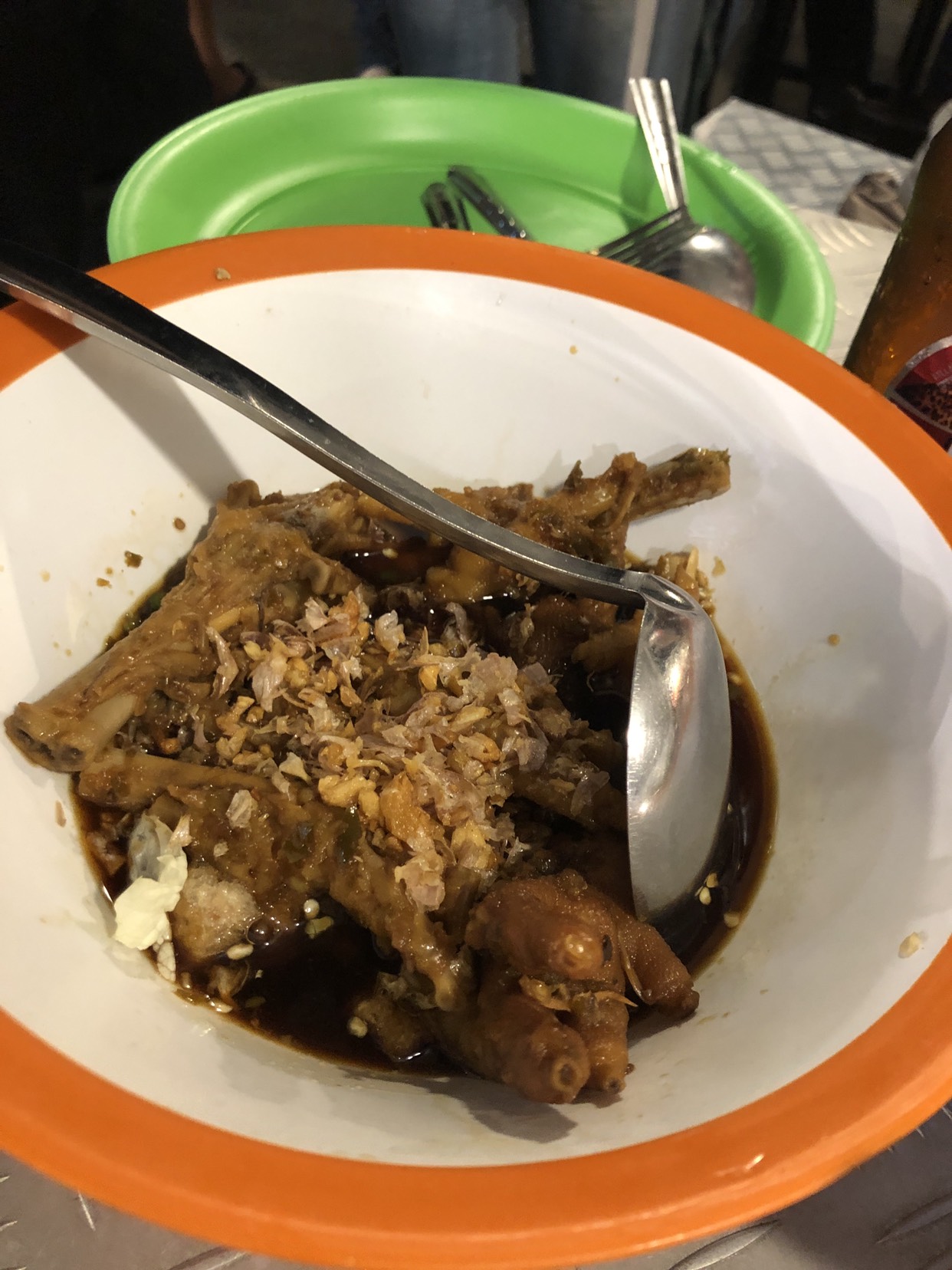 后门进去的 一进去就是火山排骨 大份确实很壮观 人多可以感受下 味道还好 带点酸 特色卤鸡爪就酸的不太能忍受了 酒吧区人不多还很诧异 结果走到前区吃饭的几排商户 妈呀 擦肩摩踵 热的一身一身汗 执着的找刨冰西施 点的菠萝冰 70株就当随便吃个冷饮 香蕉饼全靠巧克力酱美颜 然而每一口都是热量炸弹 焖海鲜是酸甜口的辣酱 吃多了腻歪 海鲜都是小贝类 没啥好吃的 肋排就更普通 就是看着过瘾 但其实现在都不缺肉 抱着这个吃两口就够了 售货摊贩基本都是很普通的夜市小商品 没什么特别 要不是有网红点可以打卡让人有点奔头 真是找不到啥乐趣……