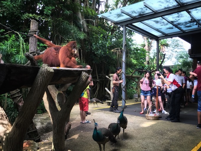 今天的重头戏就是与魅力超凡的红毛猩猩共进早餐,这样的机会不是每天都有,而 新加坡 动物园是世界上唯一提供此难得机会的动物园。吉祥物红毛猩猩阿明是动物园的明星,现在已经去世,它是 新加坡 孩子们的记忆。早餐的宣传语是:“世界上唯一能让您与红毛猩猩一同用餐的地方!一日之计在于晨,不如和我们的森林之友们一同迎接一天美好的开始吧。”如果预订了与红毛猩猩共进早餐,可千万别睡懒觉哦,阿明餐厅早餐时间为9:00至10:30,动物亮相时间只在于上午9:30 - 10:00 之间,早餐最后入席时间是在上午10:00。一落座,就被地上自由行走的孔雀吸引,它们昂着头,旁若无人地走来走去,高傲地像个公主。9点半,红毛猩猩会从高高的树枝上晃荡下来,集体亮相餐厅,在旁边的小木台上进食~游客可以排队靠近拍照,与大多数景区一样,有工作人员会拿专业相机帮拍,如果要照片的话,另外付费购买,当然没有强制,他们也会拿你的照相设备为你免费拍照。早餐品种还算丰富,西式和本地美食都有,我们默默念着,吃一顿管两顿,愣是从头吃到尾。