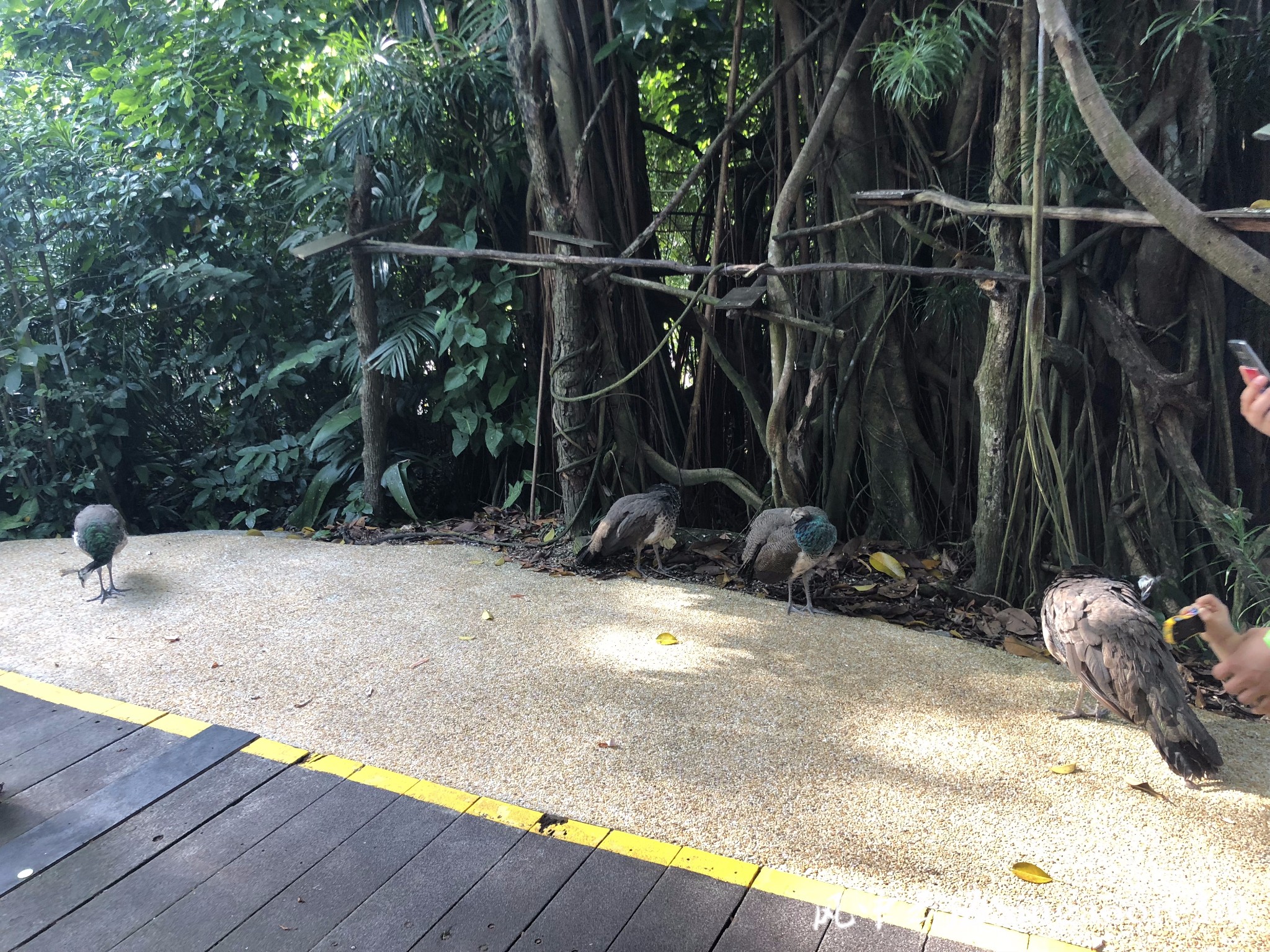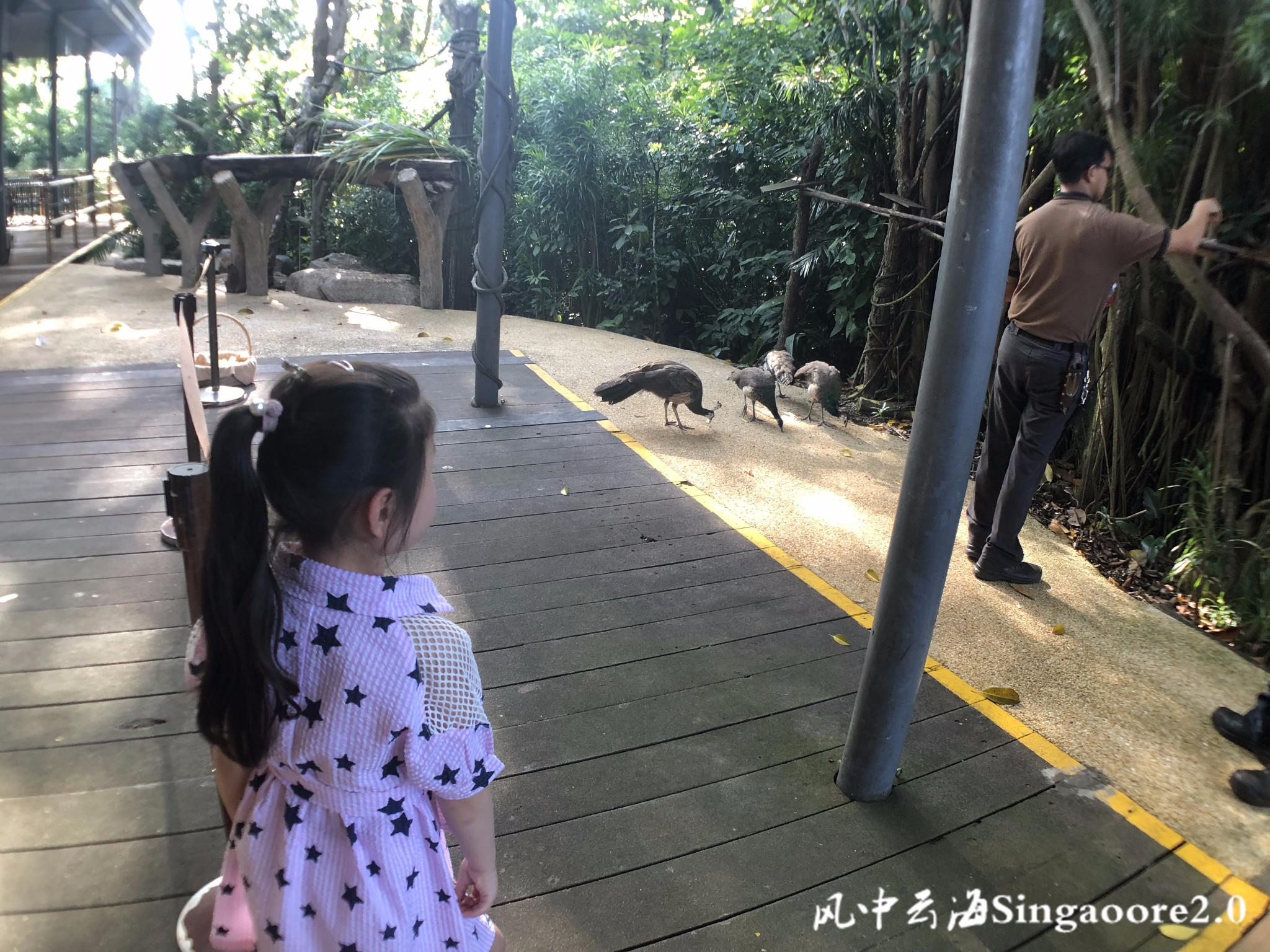 入园会有工作人员提供中文版的地图,延着长廊走不了多远就到了阿明餐厅,我们的位置还不错,没有很靠后,娃儿顾不得吃饭只盯着随意走动的孔雀们看,然后总结:妈妈,这些都是不漂亮的孔雀。。。。