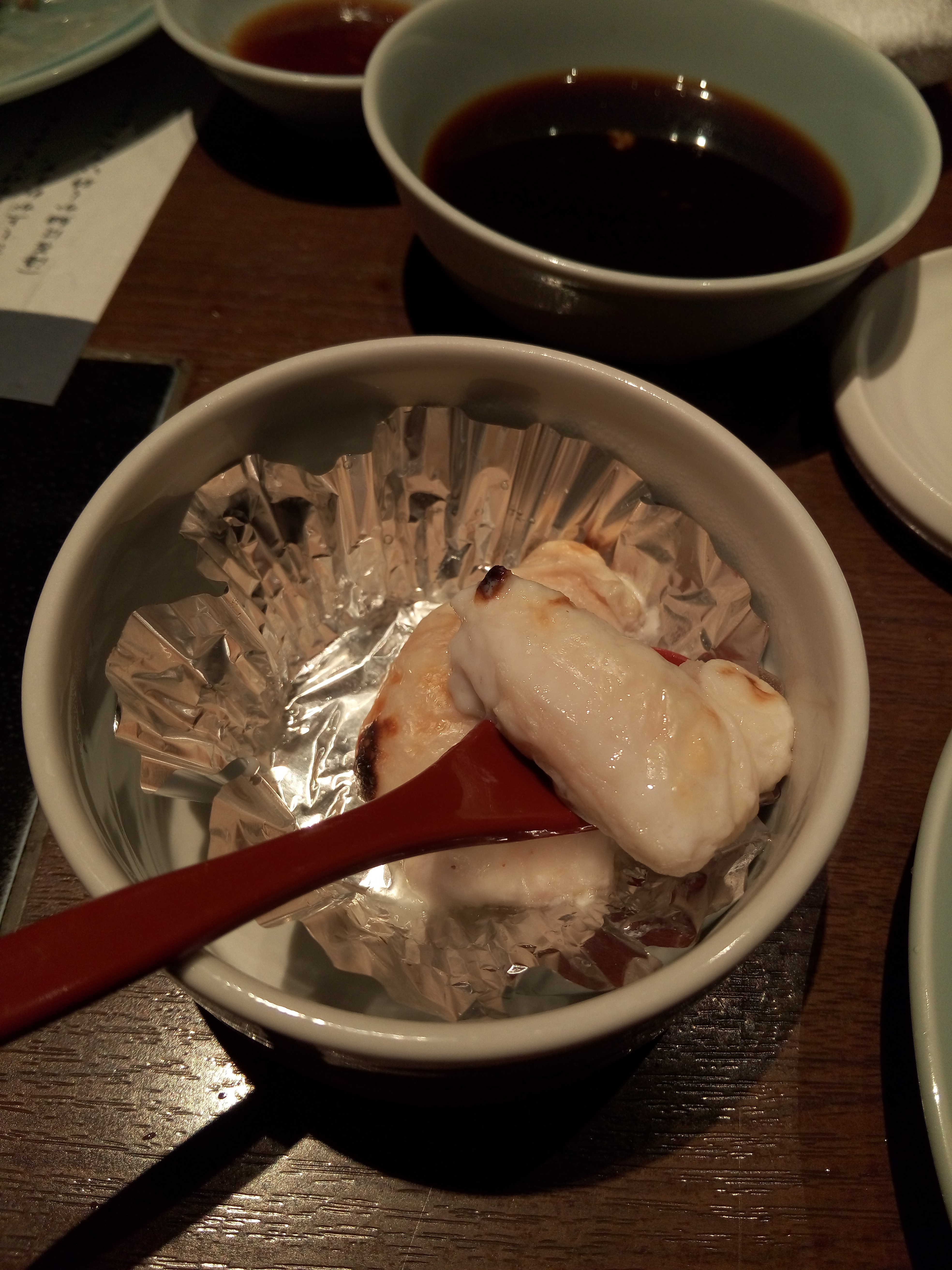之前在大阪的黑门市场吃过河豚鱼刺身,可能是因为刺身切好摆在外面的时间长了,肉质感觉一般。但这次在虎河豚亭的感觉完全不一样,刺身之后是火锅,还有炸河豚鱼块和泡饭,烫火锅的河豚鱼肉端上来的时候还在跳,煮过的河豚鱼肉很有嚼劲,很神奇的纸火锅再怎么沸腾都不会破,口感有点类似牛蛙