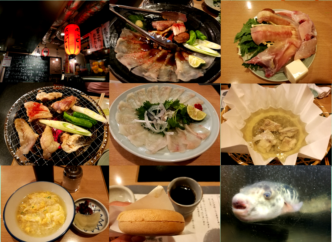 前往预定的虎河豚亭吃河豚料理啦。由于人多,我们提前预定了包间。它家有很多连锁,名气与玄品河豚不相上下,服务员不会中文,英文也很差,但是有套餐可选,基本可以保证点明白餐。套餐有4980日圆、6980日圆两种可选,我们混着点的,所以现在我也也分不太清哪个菜是哪个套餐的了,都展示一下吧。PS:中间的篮子+纸其实是做火锅用的,涨见识了。第一道菜:醋拌河豚皮第二道菜:河豚刺身第三道菜:炸河豚第四道菜:涮河豚(其实还有很多配菜,忘了拍了)第五道菜:涮河豚鱼皮(也忘了拍了)第六道菜:涮河豚汤熬粥(这道最受妈妈们的欢迎)第7道菜:咖啡味儿icecream(超好吃)别看量少,但是真的吃的挺饱的。