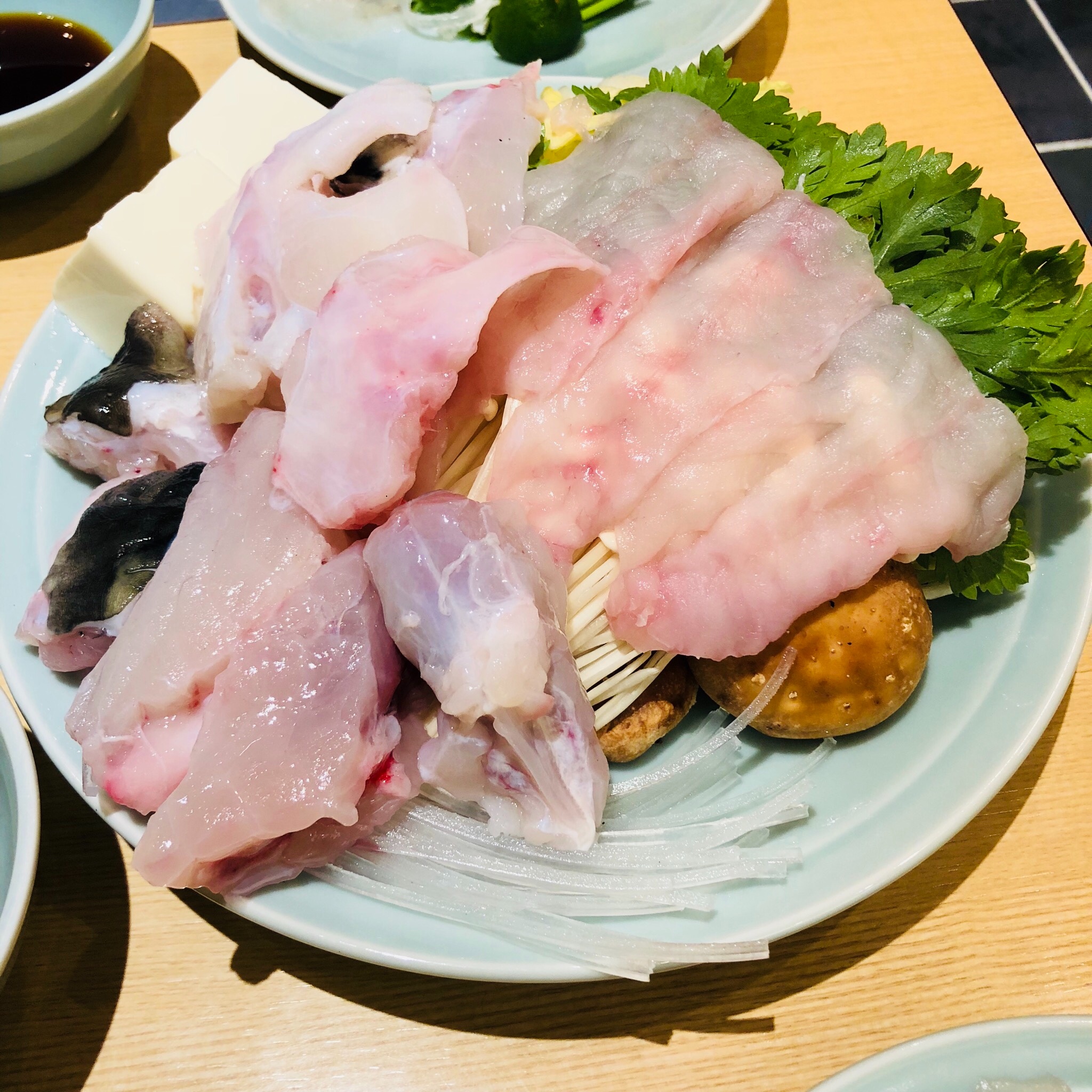 前往预定的虎河豚亭吃河豚料理啦。由于人多,我们提前预定了包间。它家有很多连锁,名气与玄品河豚不相上下,服务员不会中文,英文也很差,但是有套餐可选,基本可以保证点明白餐。套餐有4980日圆、6980日圆两种可选,我们混着点的,所以现在我也也分不太清哪个菜是哪个套餐的了,都展示一下吧。
