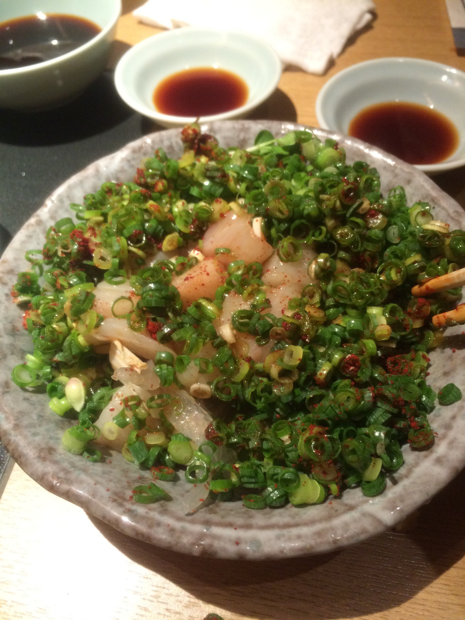 点了鱼生厚切和生鲜河豚什锦锅。一个人吃感觉量也差不多了。什锦锅的鱼肉上来时候还是会抽动的,说明新鲜吧。除了柚子醋,没有其它调料,味道非常淡。喜欢重口的估计不太能接受吧。尝尝鲜还是可以的。只做晚上生意,特别提醒!