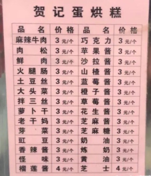 第一次吃蛋烘糕不知道怎么点,就按照点评的推荐报了前三个:奶油、沙拉肉松、花生酱芝麻糖,自己报的时候没啥底气,都不知道要吃的是啥。个人觉得沙拉肉松很好吃 另外两个有点甜了。事后看了看价目表,我才get到点单方式,表格里的品类可以1-2个叠加,一般是酱+××× 3元里的所有叠加后还是3元,只有榴莲和芝士是4元。吃完三个后还想尝试别的口味,但是因为之前在路上买了杯加料的coco,我们实在是吃不动了。