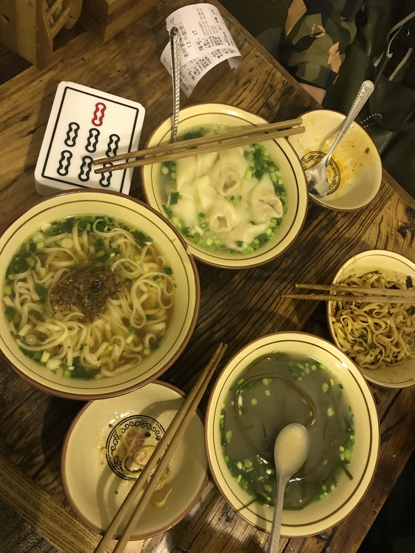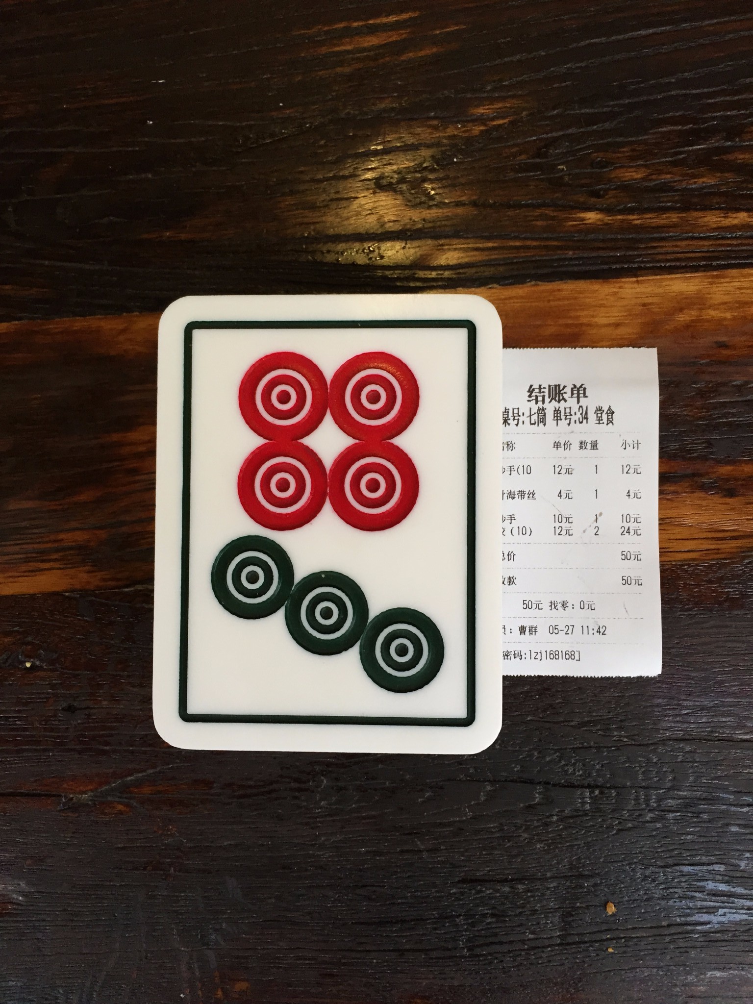 这家店就在陈麻婆豆腐骡马市店的后门,吃完陈麻婆没有满足就又来碗钟水饺,哈哈哈,罪过罪过。这家店有个特色就是点餐之后,会发给你一个巨大的麻将牌(我拿的是二筒),送餐员按照桌子上摆的麻将牌对应送餐,可见成都人是有多爱打麻将。