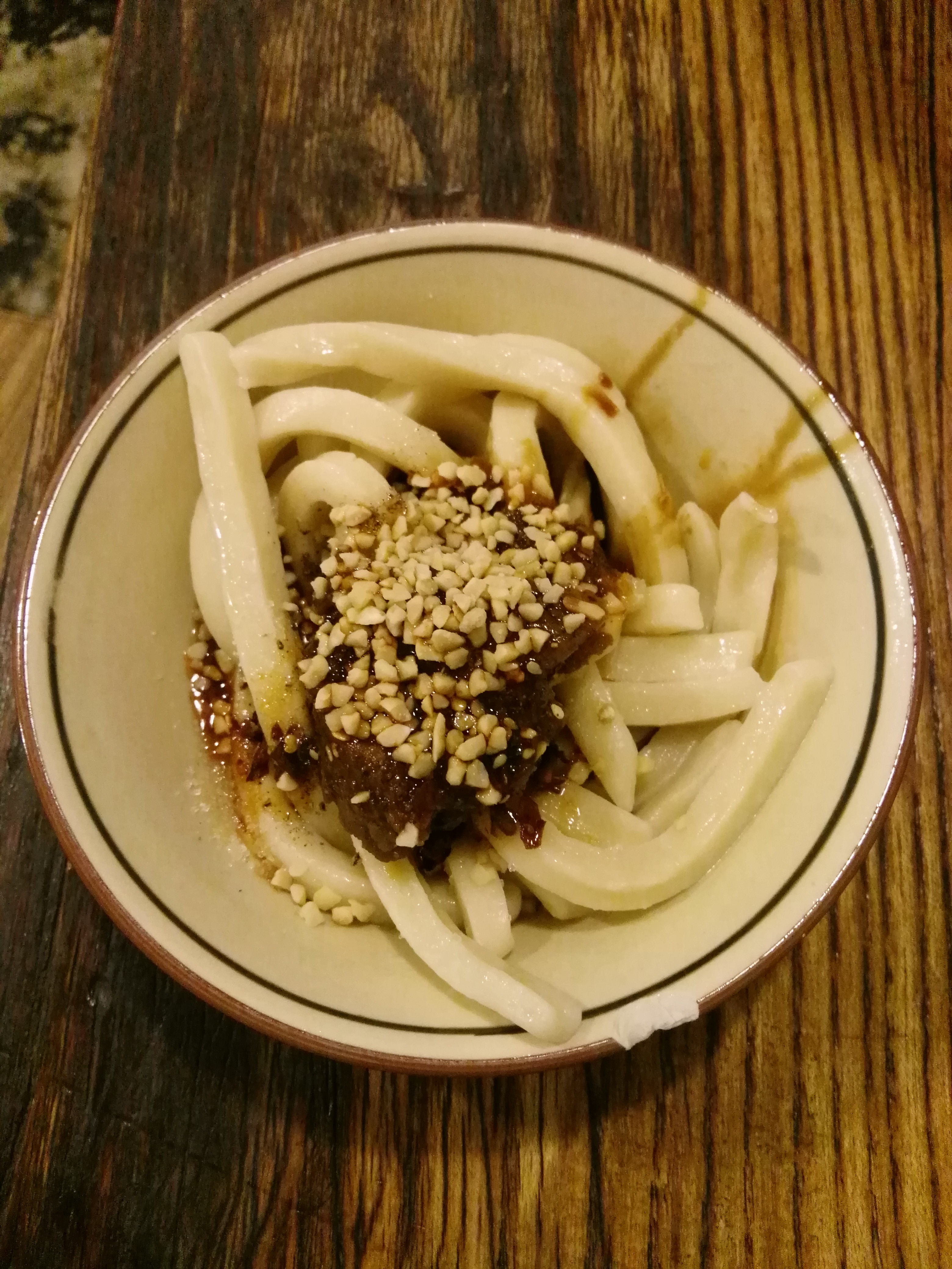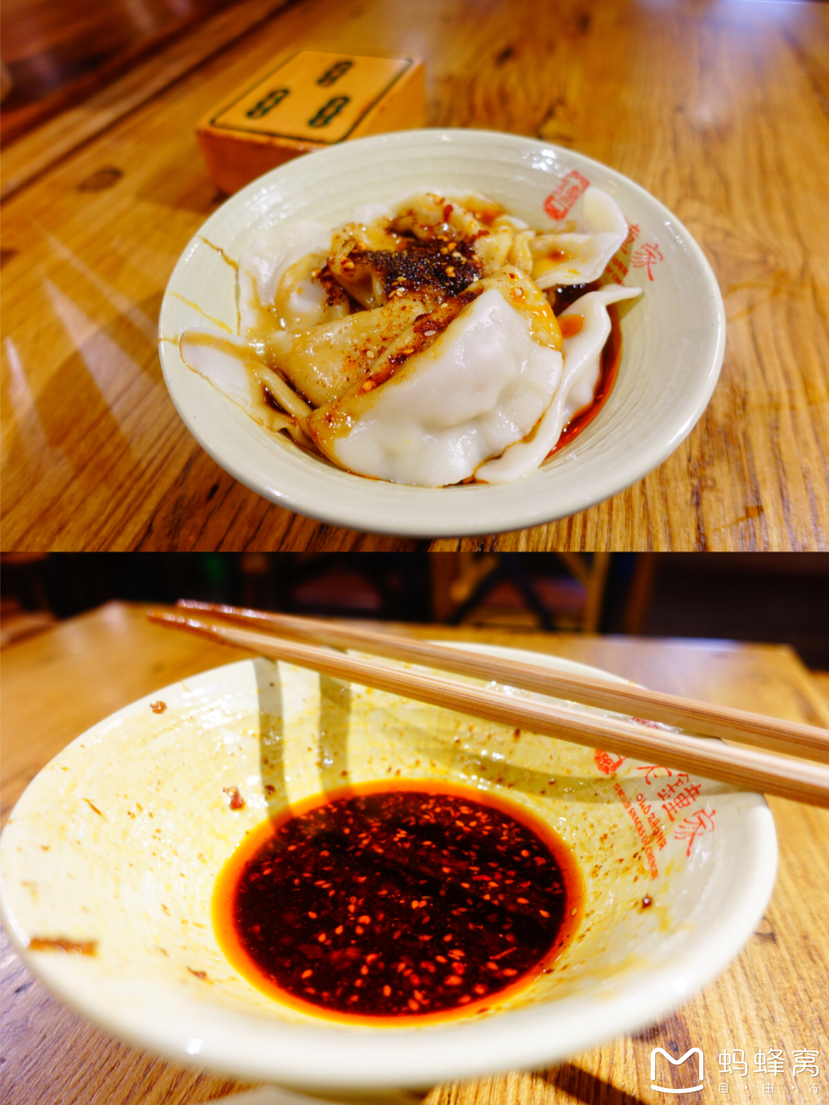 店面很小人却超多,我们去时只能坐外头的马路牙子上了,水饺上的有点慢,貌似点一份才包一份下锅煮,但是尝到味道后就直拍大腿,和北面的干饺子、南面的汤饺子不一样,它是拌饺子,香味扑鼻,色泽鲜艳,一口咬下去不会流出烫嘴的油,只会感觉到肉馅的紧实和Q弹,相比之下我超爱的担担面也失去了风味,以至于后面再来吃了一次还心心念念打包回去。它家的叫号牌也很有特色,全是麻将牌子,很有成都风味