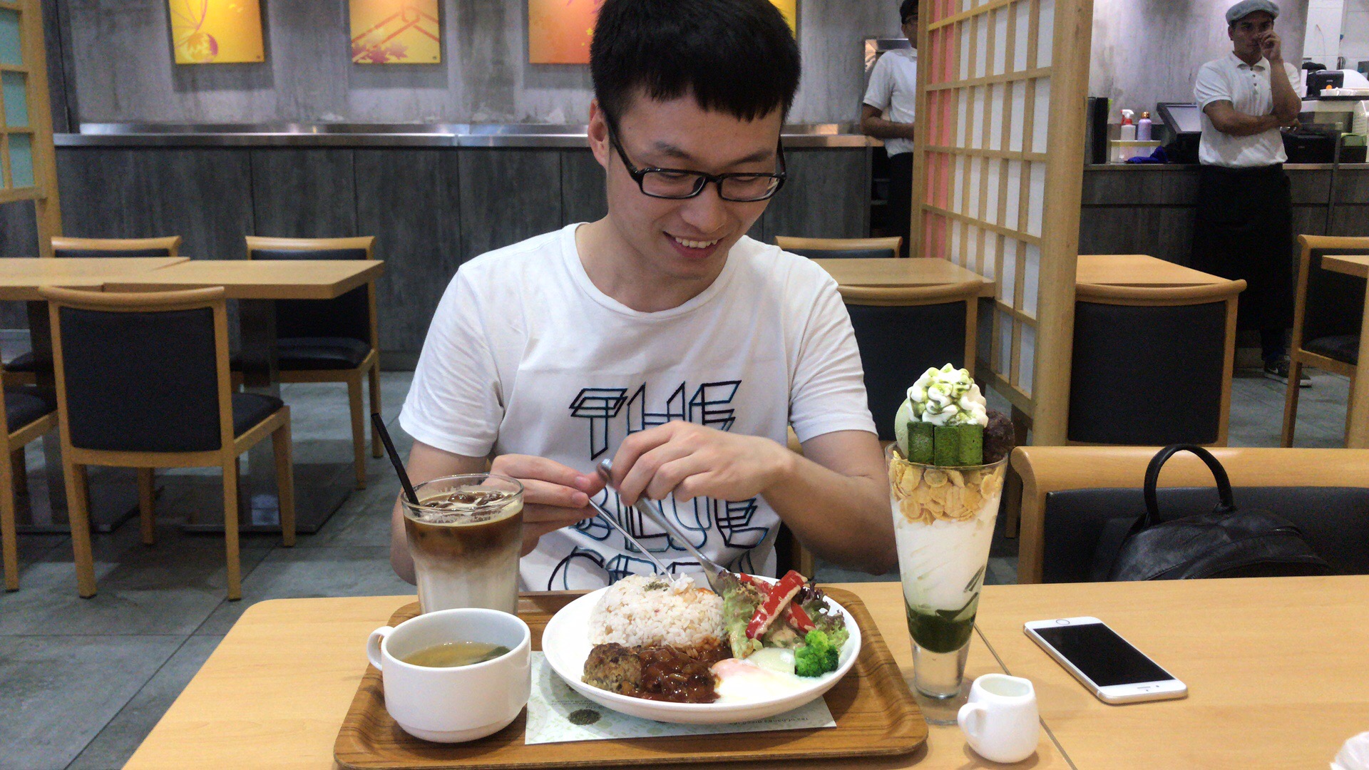 好好吃,点了一份咖喱牛肉饼的椰浆饭套餐、冰咖啡和甜品,一共50 RM。