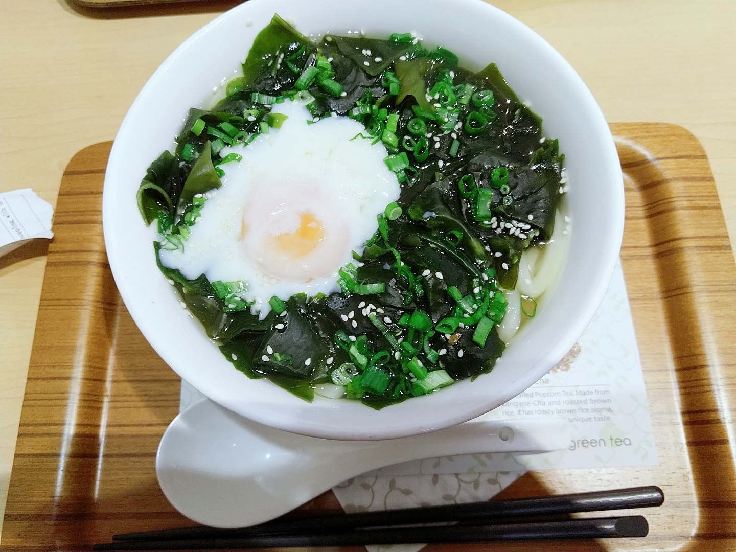 我点的海带乌冬面,后悔了,完全吃不惯,不喜欢粗的面条(当然这不怪人家,是我自己吃不惯而已),海带有点硬而且淡而无味,唯一可取的就是颜值很高,看上去很有食欲,汤头很鲜美,让我总算得到些安慰。