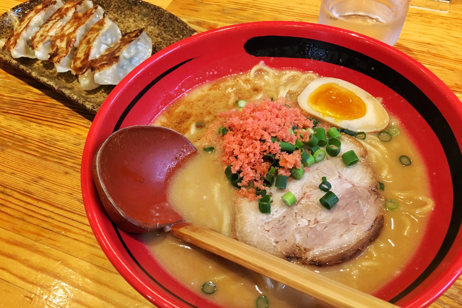 一幻的面是甜虾熬制的汤底,点了一份名字叫做“适当的特制汤底加味增调味”的极太面,还有一份饺子。啊……还是饺子比较好吃……面780円,不算贵。一幻的面太咸了,上面红色的东西是有虾油炸过的红生姜末,吃起来很像弄碎的虾片,这个算是一幻的特色,不过这玩意入水很快就变成软绵绵的东西了,口感一泻千里。一幻的汤,真心,太咸了。我跟同伴终于明白了五郎为什么吃面要配白饭,因为齁的啊!个人对一幻的好感,全在碗上。