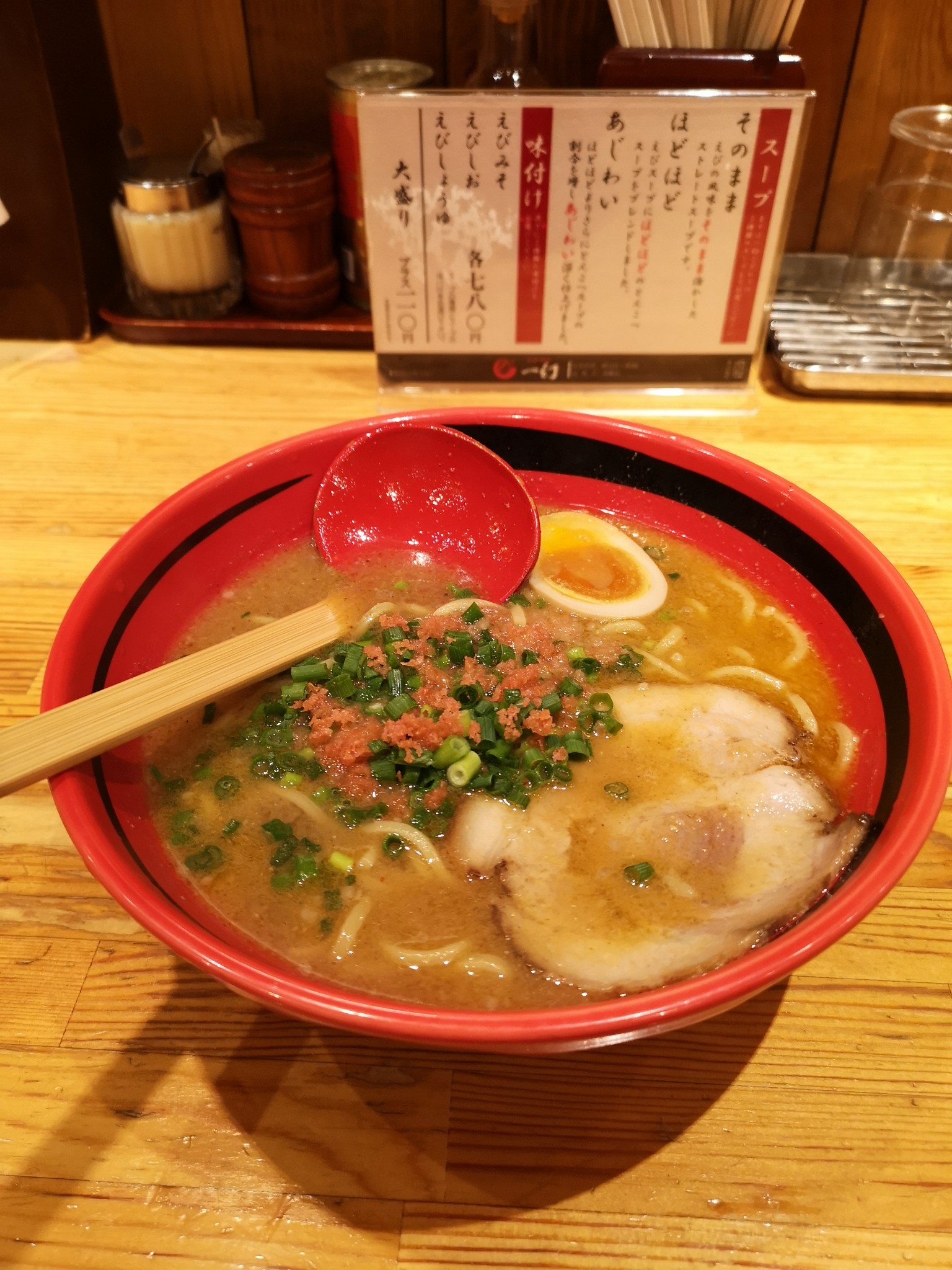 还挺大,墙上挂着各种签名,店里还坐着老外,不知道是不是个网红或者什么LP推荐餐厅。可以选择细面或者宽面。拉面本尊。汤头肥厚,这个倒不意外,但是很咸。搞得我只好偷偷的拼命往里面加水,因为要躲过店小二一脸问号。在这里,还要说一下拉面馆就餐的门道。当时天特别冷,我们去的时候店里没有等候的客人,有空座,所以我们就直接入座了,店小二虽然有点诧异,也没说啥(也许腹诽来着,或者说了啥俺也听不懂),很快过来抹桌子,递菜单。再来客人,我们发现虽然有空位,客人也都在等候区坐着。刚开始以为他们等人或人多,要坐在一块,后来发现好像也不是。一直到小二领位,他们才会入座。后来又去了几次拉面馆,发现拉面馆几乎都要由店小二领位后才能入座的,而不是由客人来选择坐哪儿,或者有空位我先坐了等着点菜上菜。我理解这个可能跟拉面馆明档操作的布局有关。一般拉面馆的格局像回转寿司店一样,厨师和顾客是靠一个封闭的台子分隔开。厨师在里侧操作,客人在外侧用餐,中间是个分隔的餐台。厨师按照点单准备好食物,直接放在客人面前的餐台上,客人取用吃完后也要把餐具搁回餐台才离开。领位入座估计一是要照顾到店小二负责收拾桌面的同时,还要招呼客人、结账(有的拉面馆没有点单机)、上酒水比较忙,再一个也是根据厨师当前的工作量来分配他服务的客人。日本大多数馆子营业面积其实都很小,高峰期等位很严重,这种营业方式可以避免有位置的人等老半天吃不到嘴,取到食物的人又找不到地方吃,还能提高翻台率,其实很值得国内餐馆借鉴。也提醒大家要是去拉面馆,即算有空位,不要急于入座,等着店小二来安排就好。
