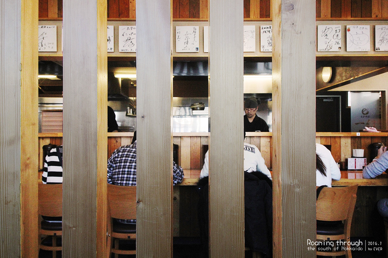 当时天特别冷,我们去的时候店里没有等候的客人,有空座,所以我们就直接入座了,店小二虽然有点诧异,也没说啥(也许腹诽来着,或者说了啥俺也听不懂),很快过来抹桌子,递菜单。再来客人,我们发现虽然有空位,客人也都在等候区坐着。刚开始以为他们等人或人多,要坐在一块,后来发现好像也不是。一直到小二领位,他们才会入座。后来又去了几次拉面馆,发现拉面馆几乎都要由店小二领位后才能入座的,而不是由客人来选择坐哪儿,或者有空位我先坐了等着点菜上菜。我理解这个可能跟拉面馆明档操作的布局有关。一般拉面馆的格局像回转寿司店一样,厨师和顾客是靠一个封闭的台子分隔开。厨师在里侧操作,客人在外侧用餐,中间是个分隔的餐台。厨师按照点单准备好食物,直接放在客人面前的餐台上,客人取用吃完后也要把餐具搁回餐台才离开。领位入座估计一是要照顾到店小二负责收拾桌面的同时,还要招呼客人、结账(有的拉面馆没有点单机)、上酒水比较忙,再一个也是根据厨师当前的工作量来分配他服务的客人。日本大多数馆子营业面积其实都很小,高峰期等位很严重,这种营业方式可以避免有位置的人等老半天吃不到嘴,取到食物的人又找不到地方吃,还能提高翻台率,其实很值得国内餐馆借鉴。也提醒大家要是去拉面馆,即算有空位,不要急于入座,等着店小二来安排就好。