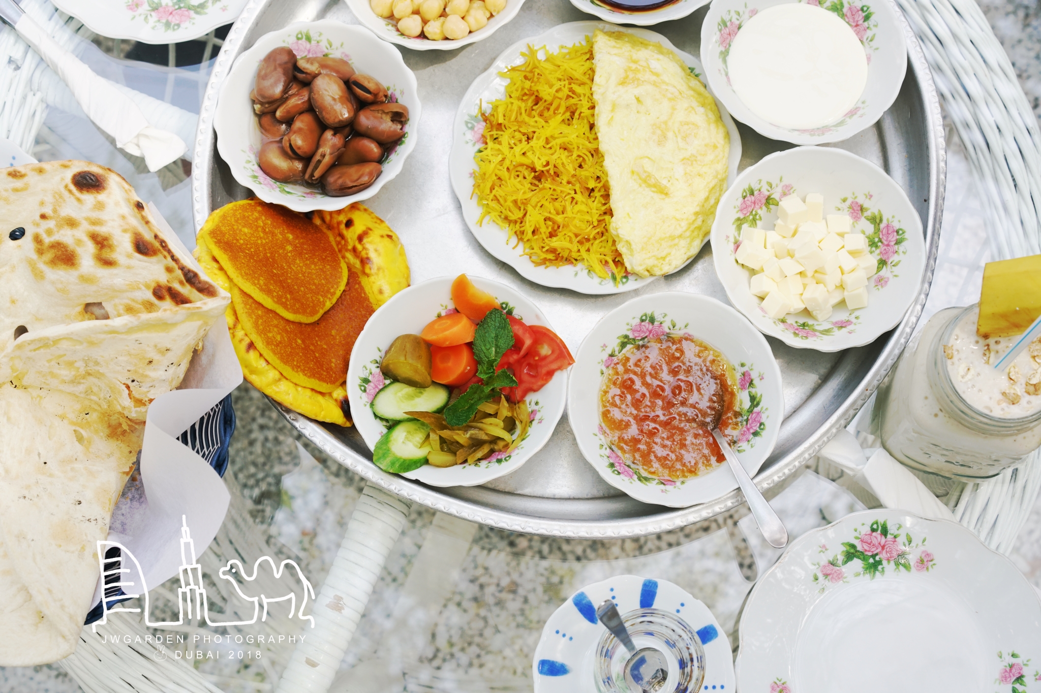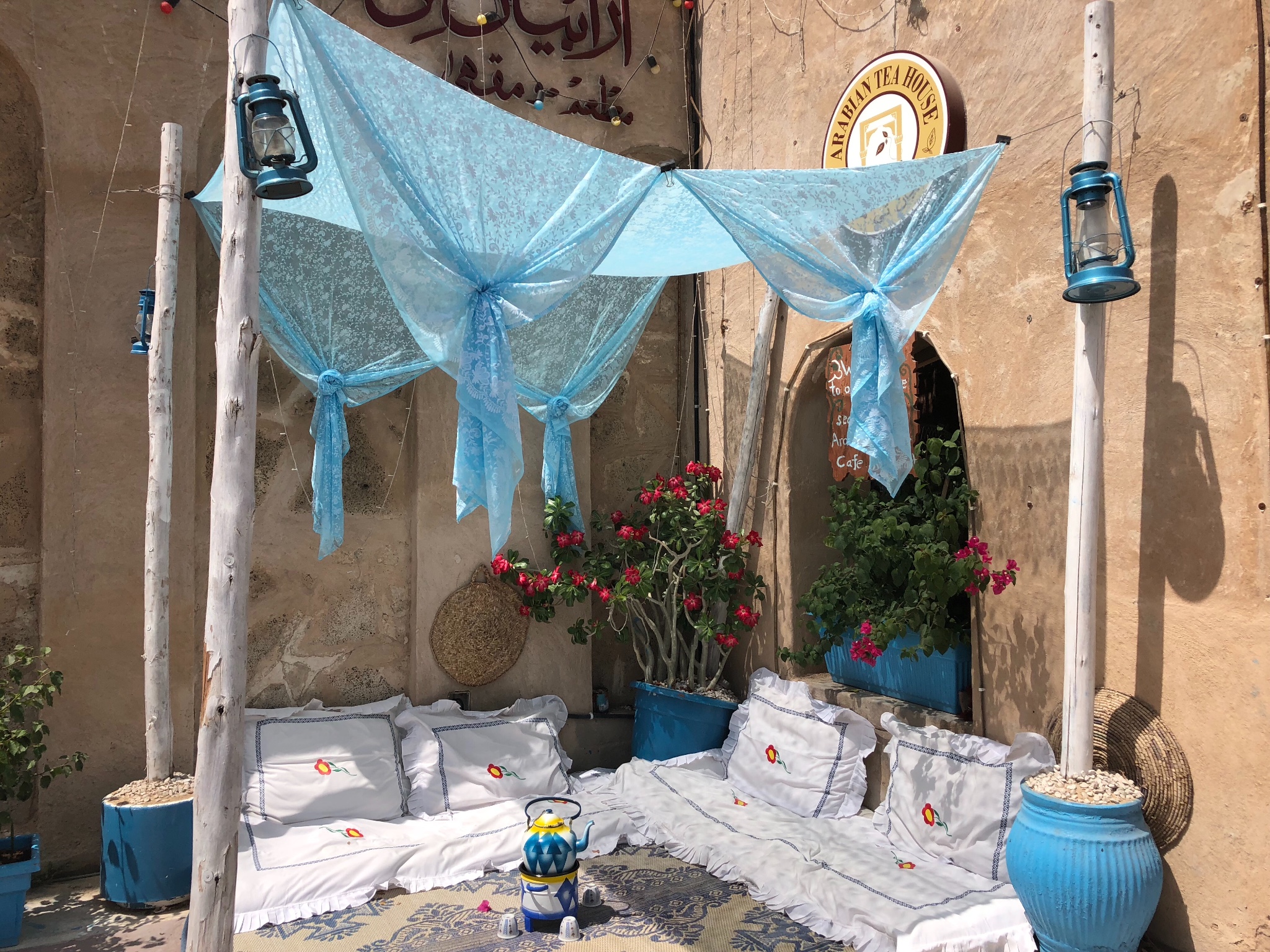 一进入老城区,这家阿拉伯风格显著的餐厅就映入我的眼帘,出发前就决定一定要去这家迪拜的小清新网红餐厅打卡。餐厅主营传统阿拉伯食物和阿拉伯茶点咖啡,整个餐厅的颜值完全就是我喜爱的风格。
