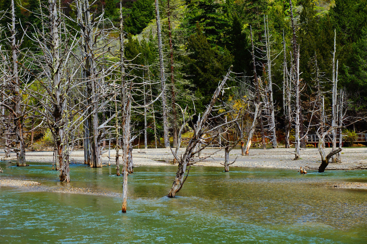 走过唐柏古道,在河道的中央,有一片干枯的树林,苍白的屹立在那里。这就是枯树滩。树木虽然失去光泽,如暮年的老者,但依然顽强的挺立,而且根根树木盘根错节,树枝造型变化多端,似龙盘蛇舞,亦如雕塑作品的会展。