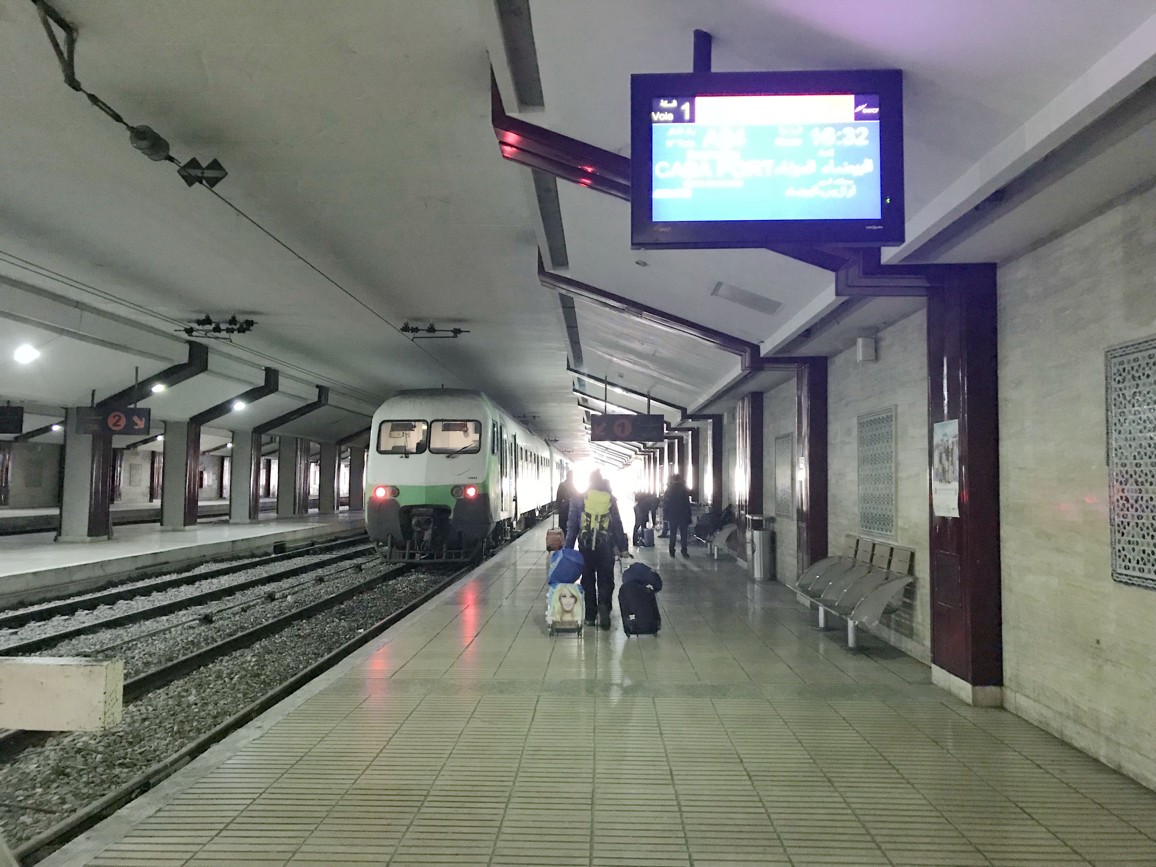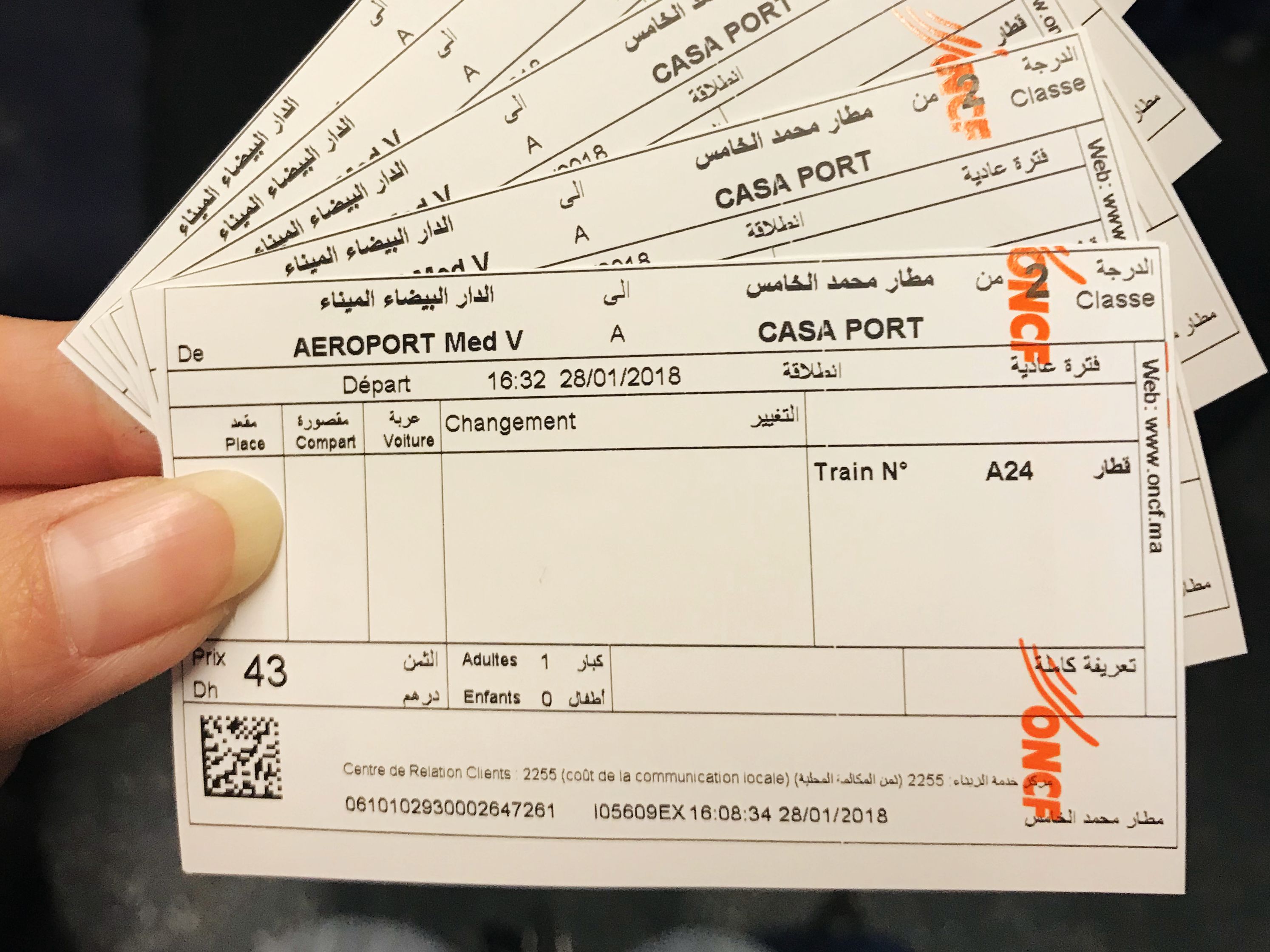 卡萨布兰卡的机场看上去并不是很大,同大多数游客一样,我们没有出机场,直接到地下一层买火车票去往卡萨市区。15:20落地,半个多小时搞定了入境、取行李、换钱、领电话卡的诸多事宜。16:08买好了16:32的车票,一切都是这么顺利和完美机场到卡萨市区的火车每天运营时间为3:00-22:00,期间大约每小时一趟,到Casa port大约1小时的车程。一等座的票价为64DH/人,二等座43DH/人。从票面上来看是有儿童票的,但是儿童的定义标准不详。
